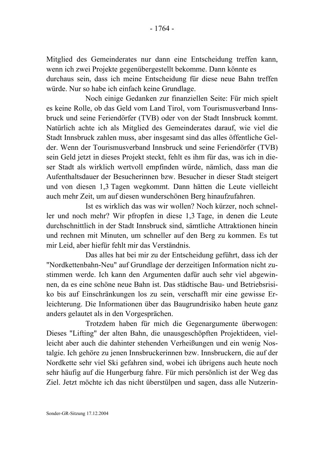 "Nordkettenbahn-Neu" auf Grundlage der derzeitigen Information nicht zustimmen werde. Ich kann den Argumenten dafür auch sehr viel abgewinnen, da es eine schöne neue Bahn ist. Das städtische Bau- und Betriebsrisiko bis auf Einschränkungen los zu sein, verschafft mir eine gewisse Erleichterung. Die Informationen über das Baugrundrisiko haben heute ganz