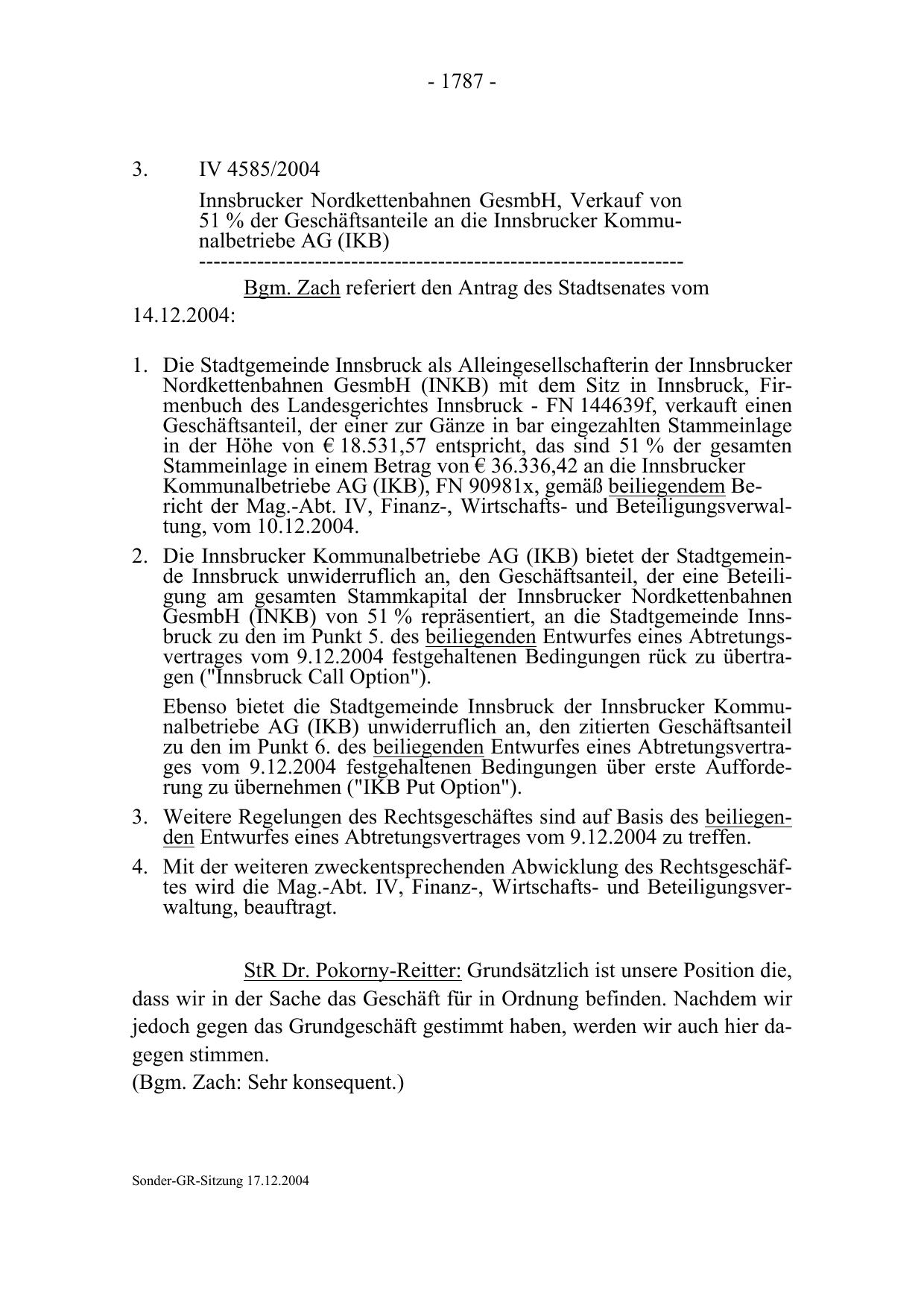 Ebenso bietet die Stadtgemeinde Innsbruck der Innsbrucker Kommunalbetriebe AG (IKB) unwiderruflich an, den zitierten Geschäftsanteil
