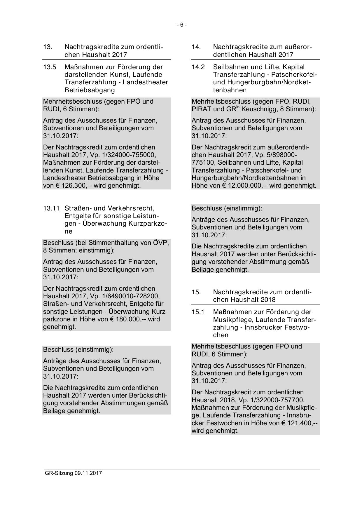 Nachtragskredite zum außerordentlichen Haushalt 2017