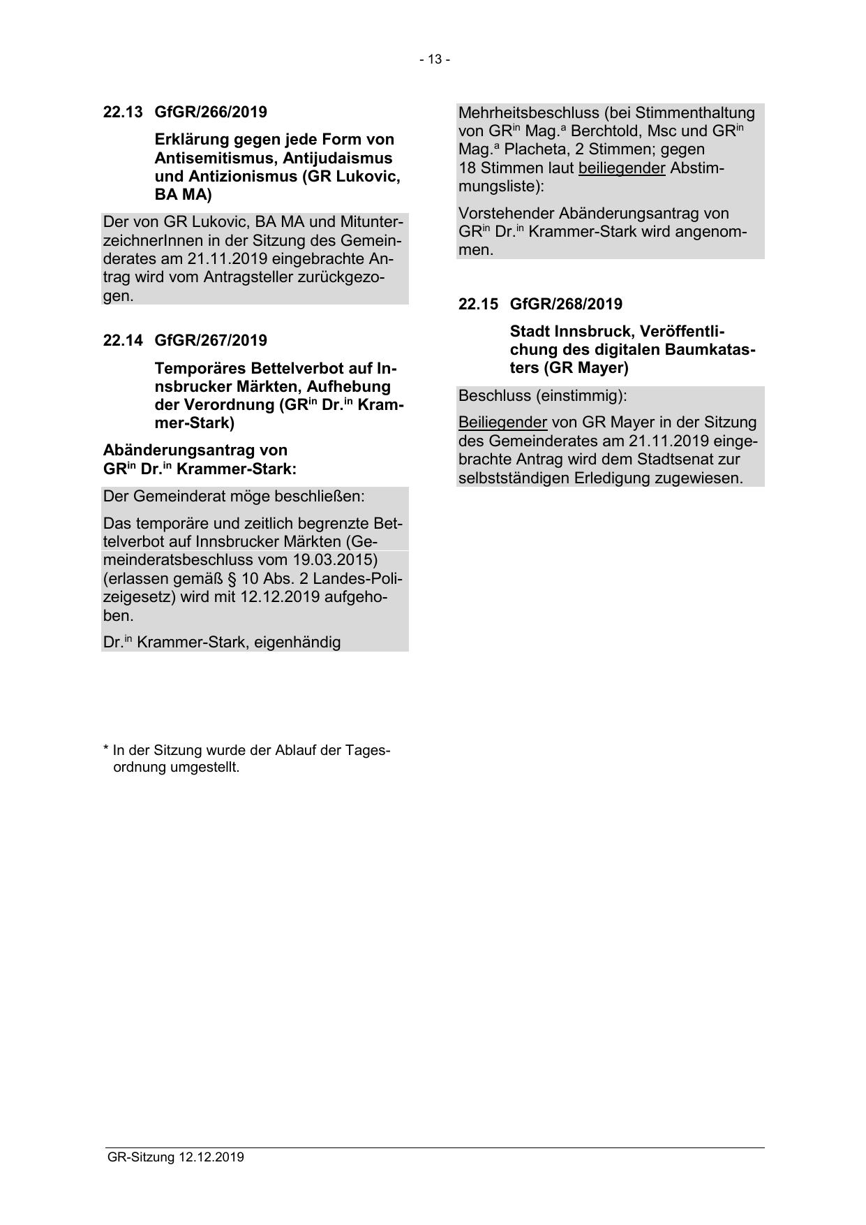 Der von GR Lukovic, BA MA und MitunterzeichnerInnen in der Sitzung des Gemeinderates am 21.11.2019 eingebrachte Antrag wird vom Antragsteller zurückgezogen.