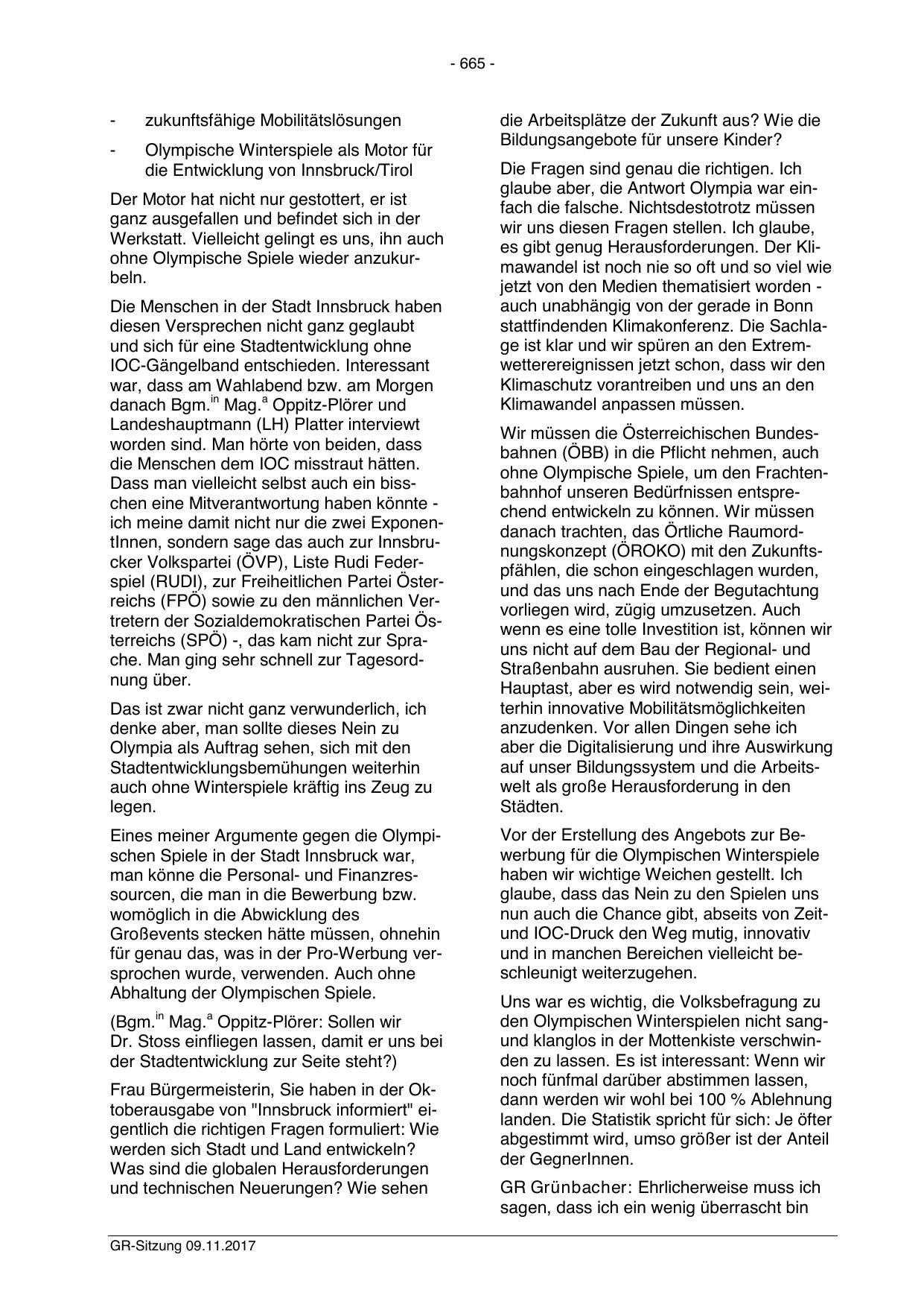 Dass man vielleicht selbst auch ein bisschen eine Mitverantwortung haben könnte ich meine damit nicht nur die zwei ExponentInnen, sondern sage das auch zur Innsbrucker Volkspartei (ÖVP), Liste Rudi Federspiel (RUDI), zur Freiheitlichen Partei Österreichs (FPÖ) sowie zu den männlichen Vertretern der Sozialdemokratischen Partei Österreichs (SPÖ) -, das kam nicht zur Sprache. Man ging sehr schnell zur Tagesordnung über.
