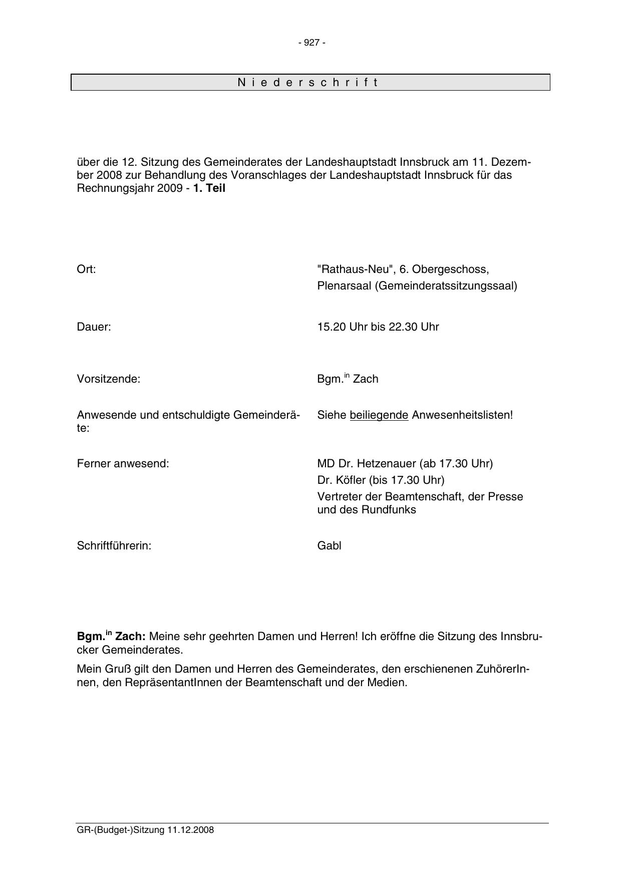 Bgm.in Zach: Meine sehr geehrten Damen und Herren! Ich eröffne die Sitzung des Innsbrucker Gemeinderates.