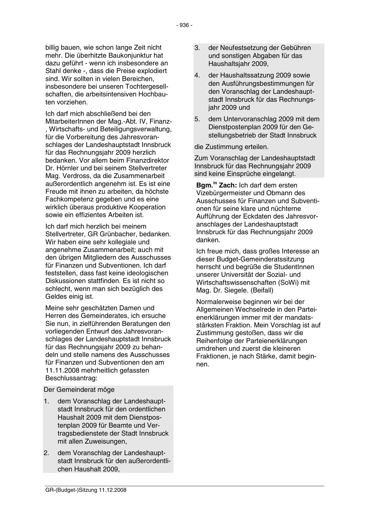 den Voranschlag der Landeshauptstadt Innsbruck für das Rechnungsjahr 2009 und