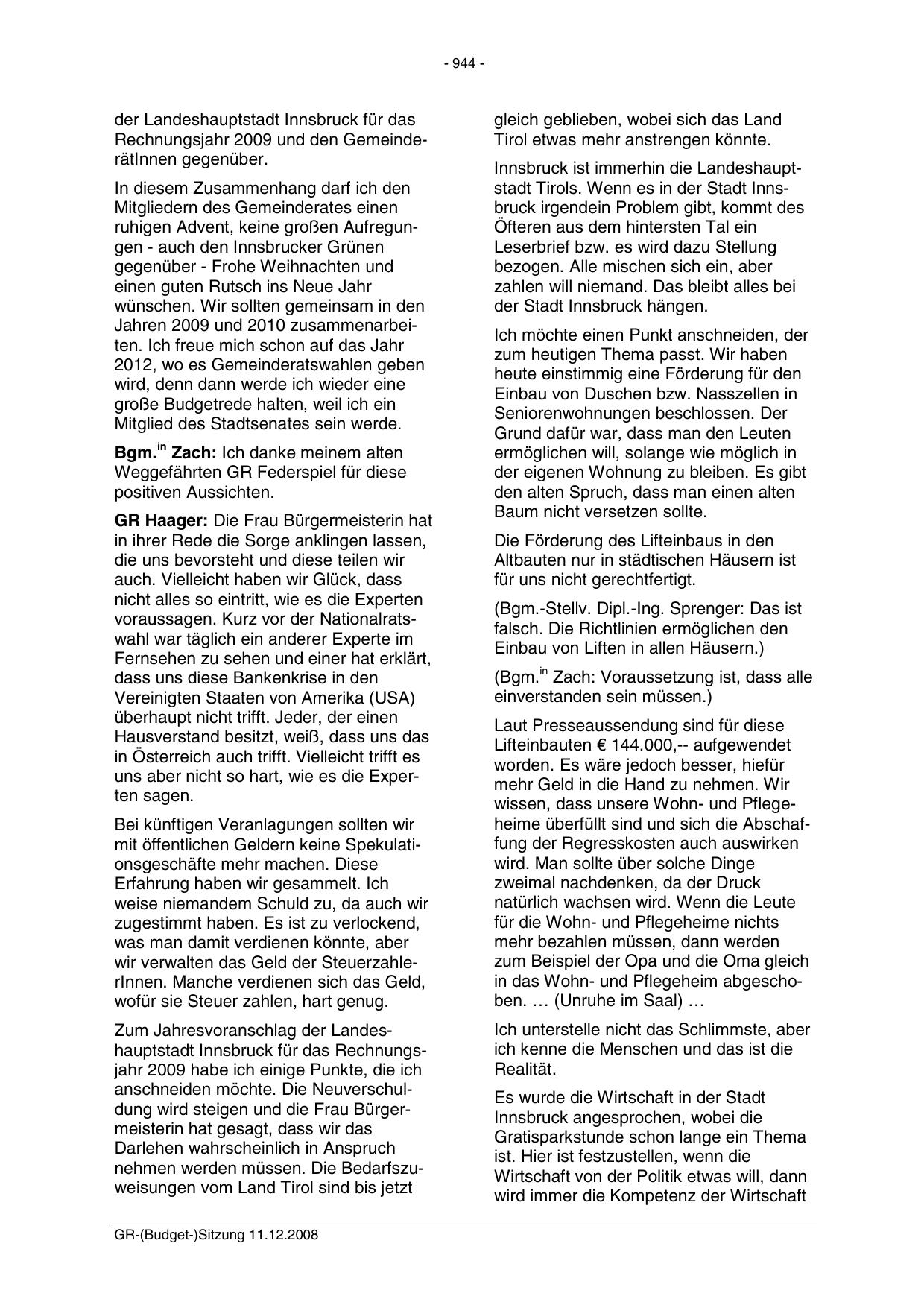 Zum Jahresvoranschlag der Landeshauptstadt Innsbruck für das Rechnungsjahr 2009 habe ich einige Punkte, die ich