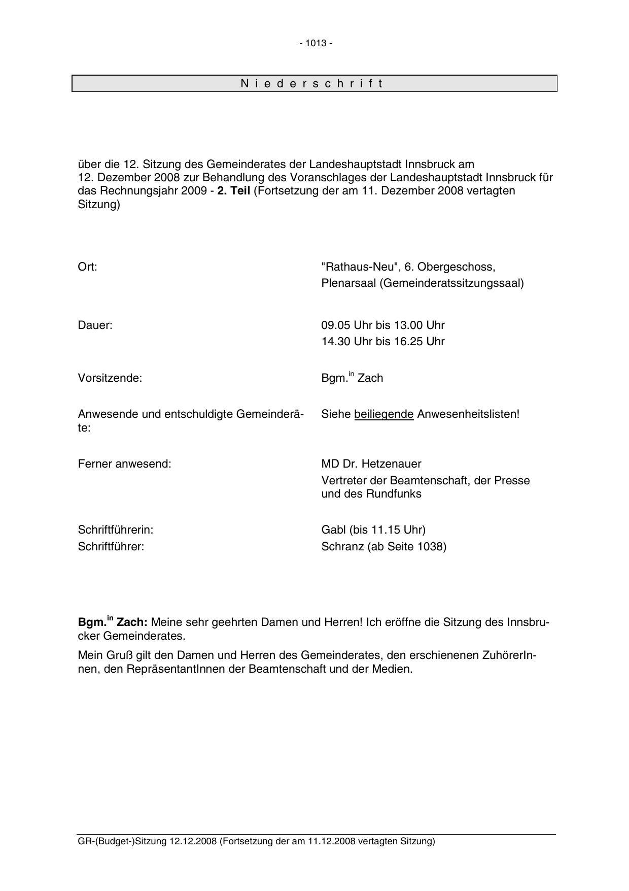 Bgm.in Zach: Meine sehr geehrten Damen und Herren! Ich eröffne die Sitzung des Innsbrucker Gemeinderates.