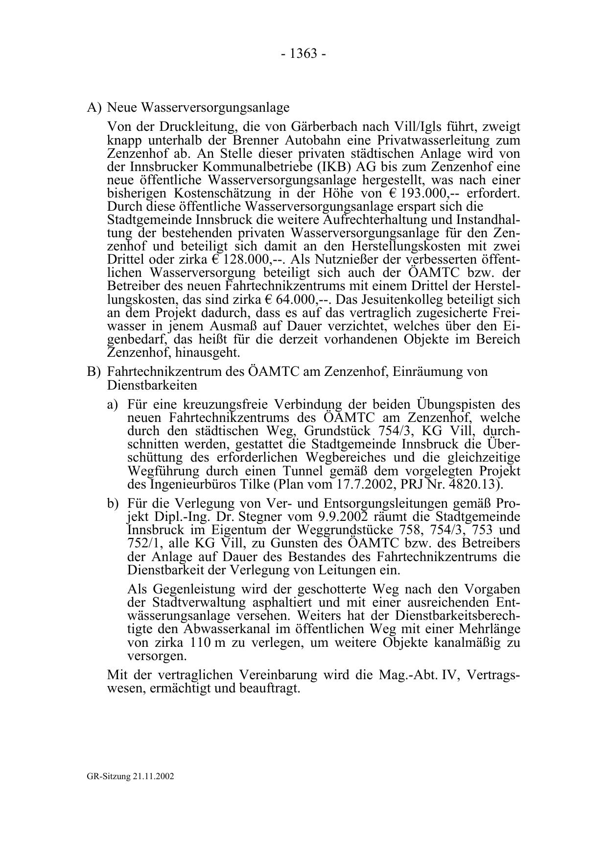 Stadtgemeinde Innsbruck die weitere Aufrechterhaltung und Instandhaltung der bestehenden privaten Wasserversorgungsanlage für den Zenzenhof und beteiligt sich damit an den Herstellungskosten mit zwei