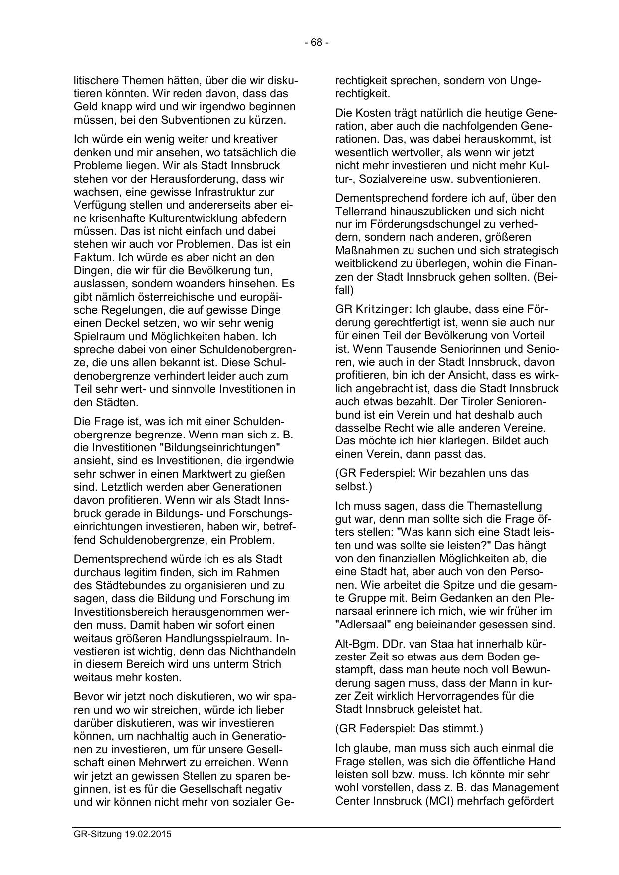 davon profitieren. Wenn wir als Stadt Innsbruck gerade in Bildungs- und Forschungseinrichtungen investieren, haben wir, betreffend Schuldenobergrenze, ein Problem.