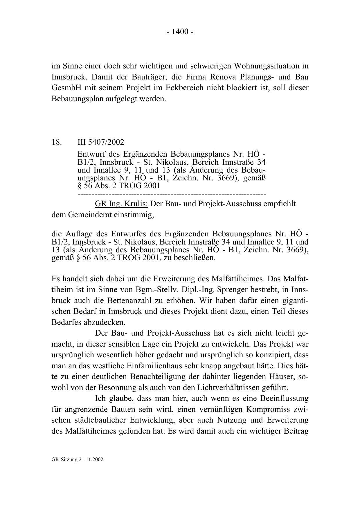 Es handelt sich dabei um die Erweiterung des Malfattiheimes. Das Malfattiheim ist im Sinne von Bgm.-Stellv. Dipl.-Ing. Sprenger bestrebt, in Innsbruck auch die Bettenanzahl zu erhöhen. Wir haben dafür einen gigantischen Bedarf in Innsbruck und dieses Projekt dient dazu, einen Teil dieses