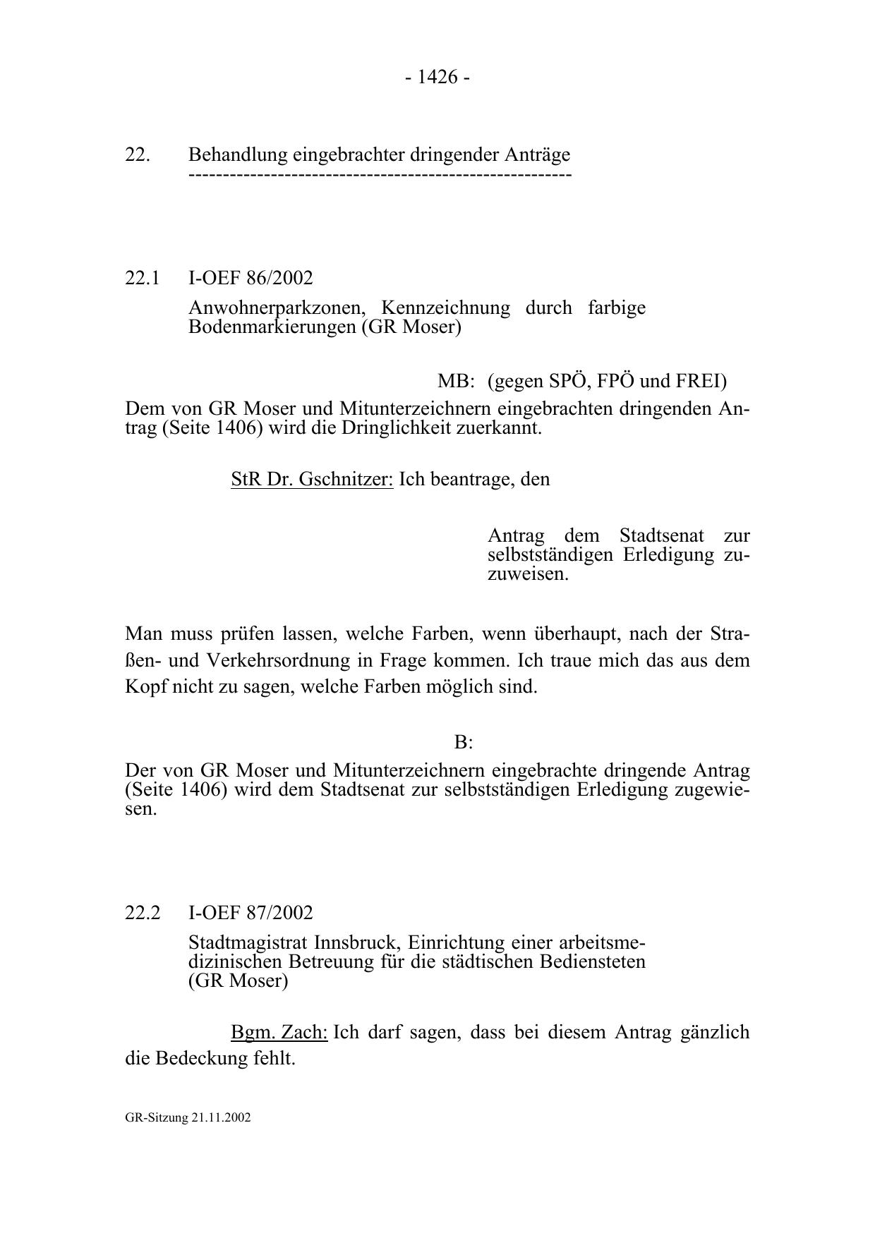 Dem von GR Moser und Mitunterzeichnern eingebrachten dringenden Antrag (Seite 1406) wird die Dringlichkeit zuerkannt.