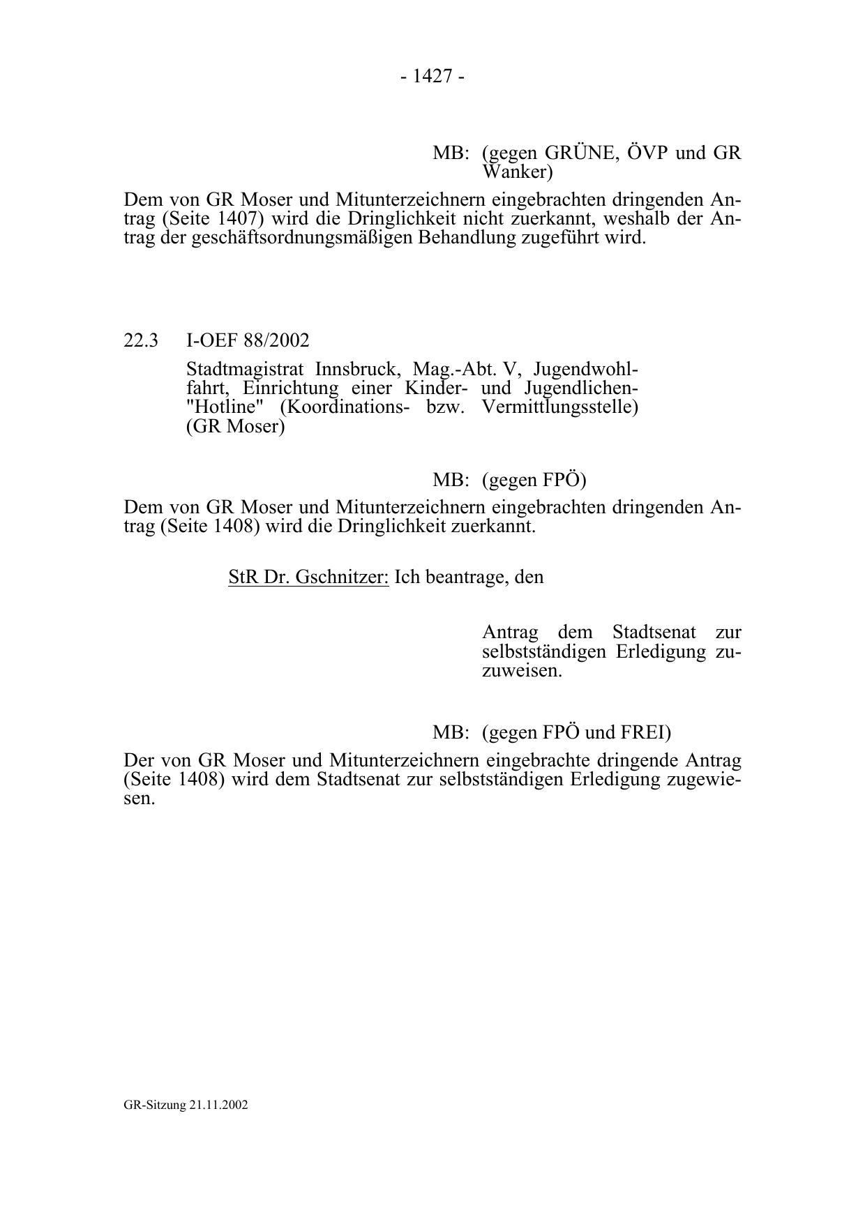 Dem von GR Moser und Mitunterzeichnern eingebrachten dringenden Antrag (Seite 1407) wird die Dringlichkeit nicht zuerkannt, weshalb der Antrag der geschäftsordnungsmäßigen Behandlung zugeführt wird.