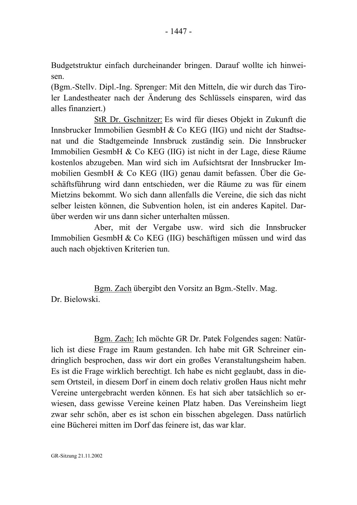 Bgm. Zach: Ich möchte GR Dr. Patek Folgendes sagen: Natürlich ist diese Frage im Raum gestanden. Ich habe mit GR Schreiner eindringlich besprochen, dass wir dort ein großes Veranstaltungsheim haben.