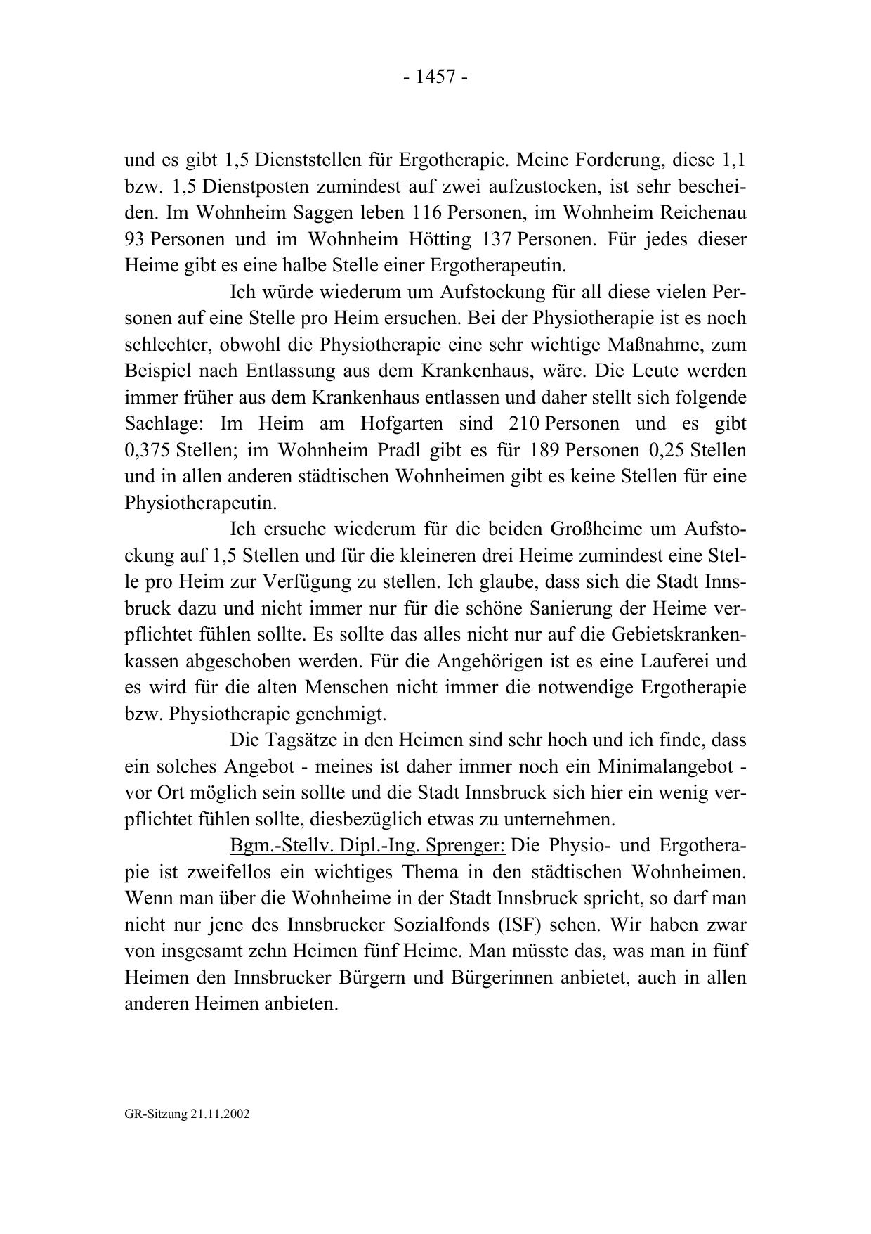 Ich ersuche wiederum für die beiden Großheime um Aufstockung auf 1,5 Stellen und für die kleineren drei Heime zumindest eine Stelle pro Heim zur Verfügung zu stellen. Ich glaube, dass sich die Stadt Innsbruck dazu und nicht immer nur für die schöne Sanierung der Heime verpflichtet fühlen sollte. Es sollte das alles nicht nur auf die Gebietskrankenkassen abgeschoben werden. Für die Angehörigen ist es eine Lauferei und