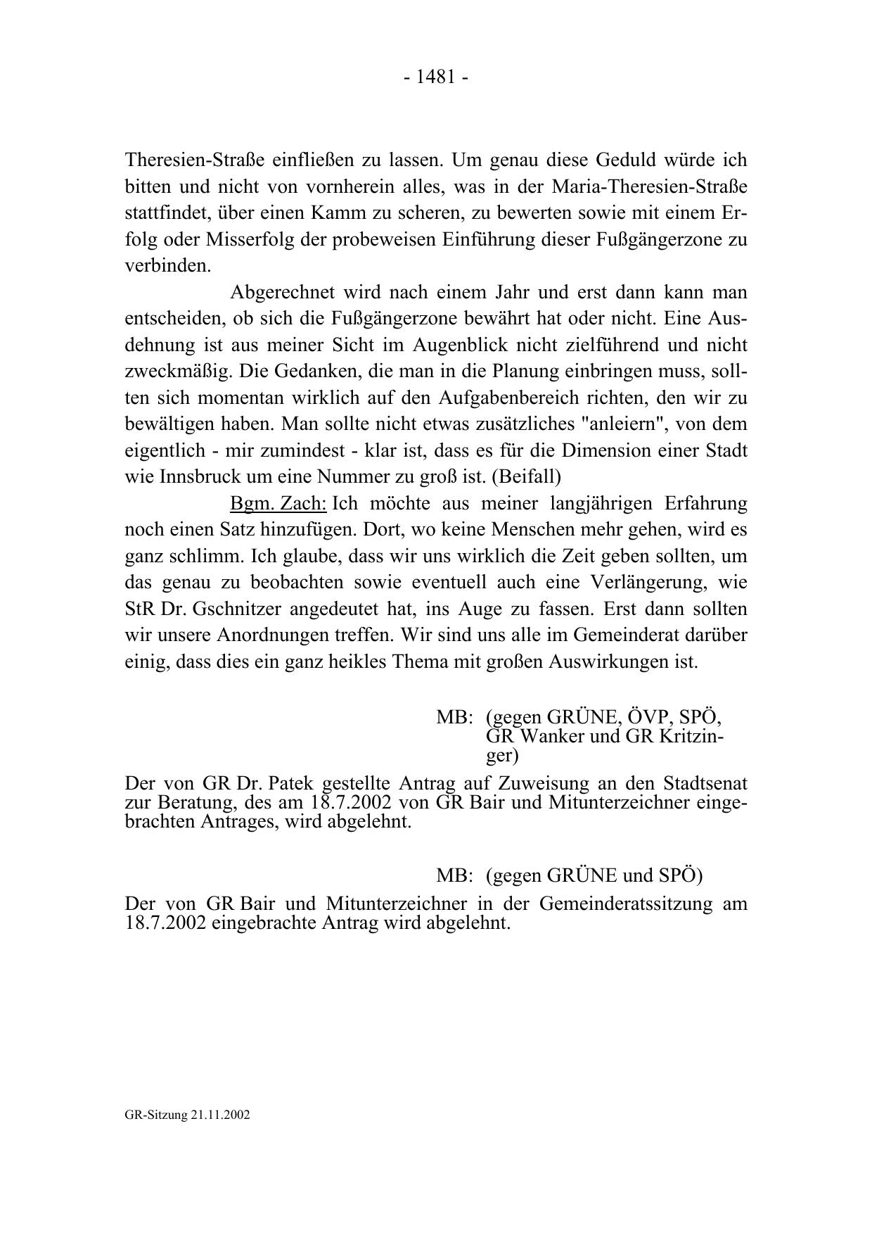zur Beratung, des am 18.7.2002 von GR Bair und Mitunterzeichner eingebrachten Antrages, wird abgelehnt.