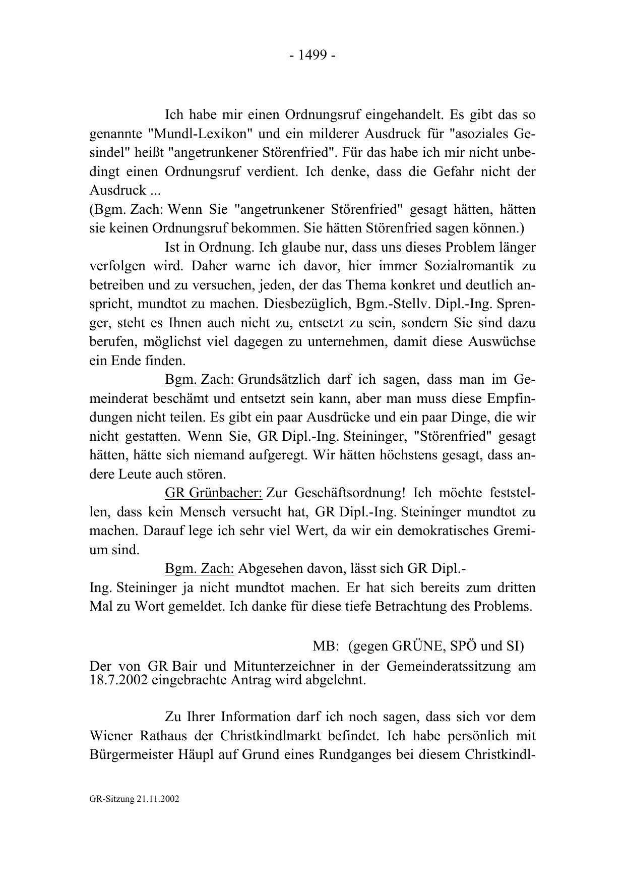 GR Grünbacher: Zur Geschäftsordnung! Ich möchte feststellen, dass kein Mensch versucht hat, GR Dipl.-Ing. Steininger mundtot zu