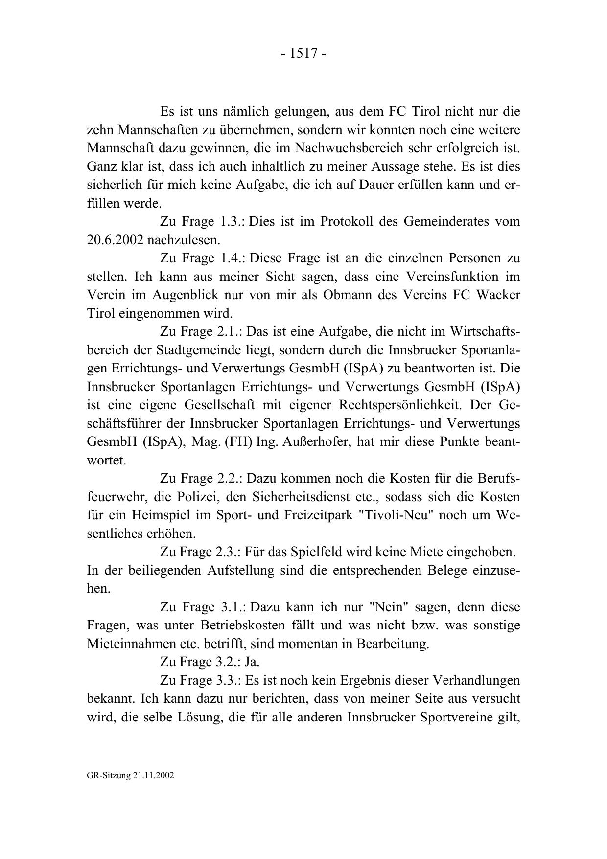 Zu Frage 2.1.: Das ist eine Aufgabe, die nicht im Wirtschaftsbereich der Stadtgemeinde liegt, sondern durch die Innsbrucker Sportanlagen Errichtungs- und Verwertungs GesmbH (ISpA) zu beantworten ist. Die