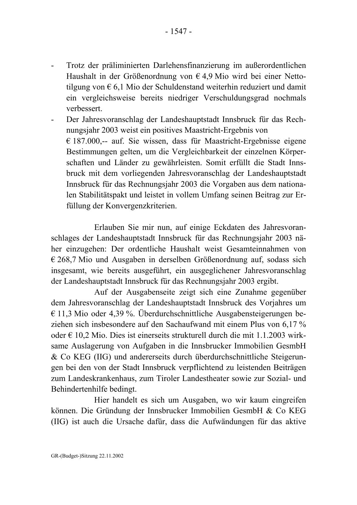 Der Jahresvoranschlag der Landeshauptstadt Innsbruck für das Rechnungsjahr 2003 weist ein positives Maastricht-Ergebnis von