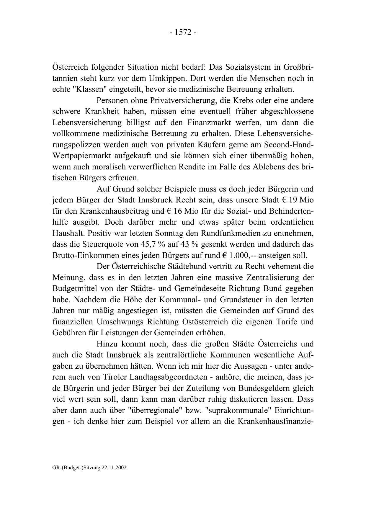 auch die Stadt Innsbruck als zentralörtliche Kommunen wesentliche Aufgaben zu übernehmen hätten. Wenn ich mir hier die Aussagen - unter anderem auch von Tiroler Landtagsabgeordneten - anhöre, die meinen, dass jede Bürgerin und jeder Bürger bei der Zuteilung von Bundesgeldern gleich