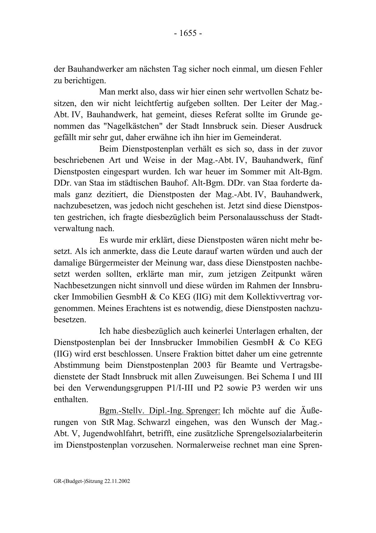 Man merkt also, dass wir hier einen sehr wertvollen Schatz besitzen, den wir nicht leichtfertig aufgeben sollten. Der Leiter der Mag.Abt. IV, Bauhandwerk, hat gemeint, dieses Referat sollte im Grunde genommen das "Nagelkästchen" der Stadt Innsbruck sein. Dieser Ausdruck