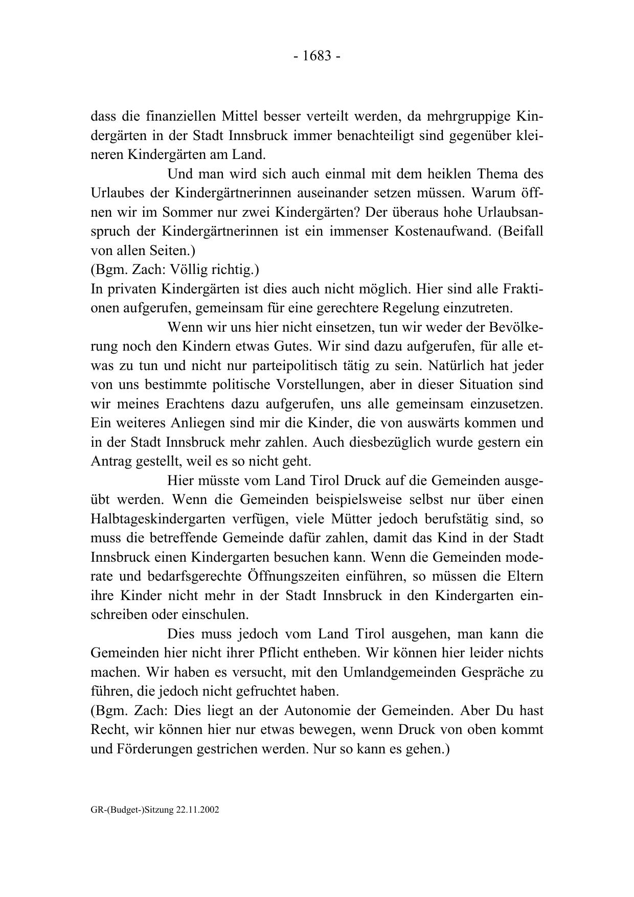 dass die finanziellen Mittel besser verteilt werden, da mehrgruppige Kindergärten in der Stadt Innsbruck immer benachteiligt sind gegenüber kleineren Kindergärten am Land.
