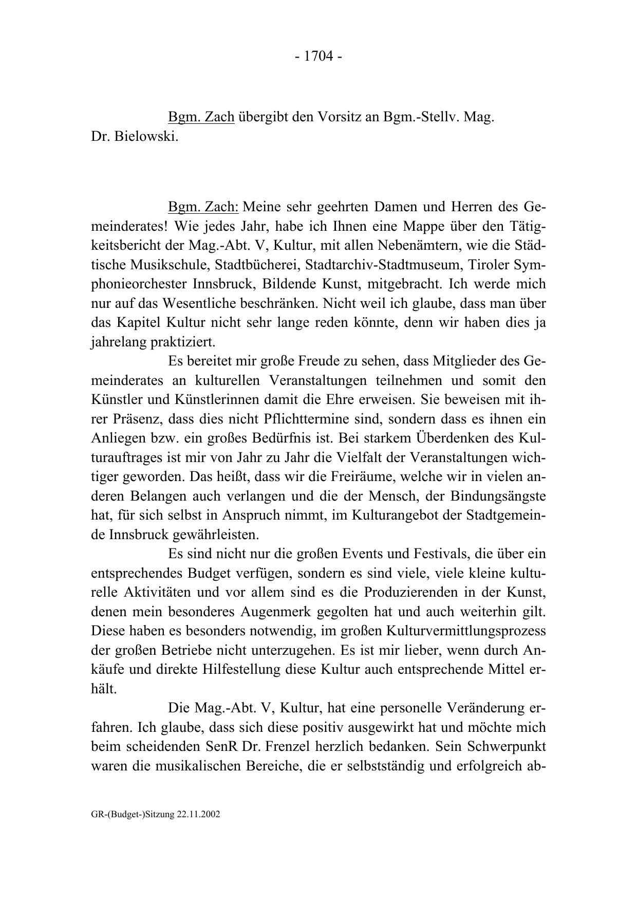 Bgm. Zach: Meine sehr geehrten Damen und Herren des Gemeinderates! Wie jedes Jahr, habe ich Ihnen eine Mappe über den Tätigkeitsbericht der Mag.-Abt. V, Kultur, mit allen Nebenämtern, wie die Städtische Musikschule, Stadtbücherei, Stadtarchiv-Stadtmuseum, Tiroler Symphonieorchester Innsbruck, Bildende Kunst, mitgebracht. Ich werde mich