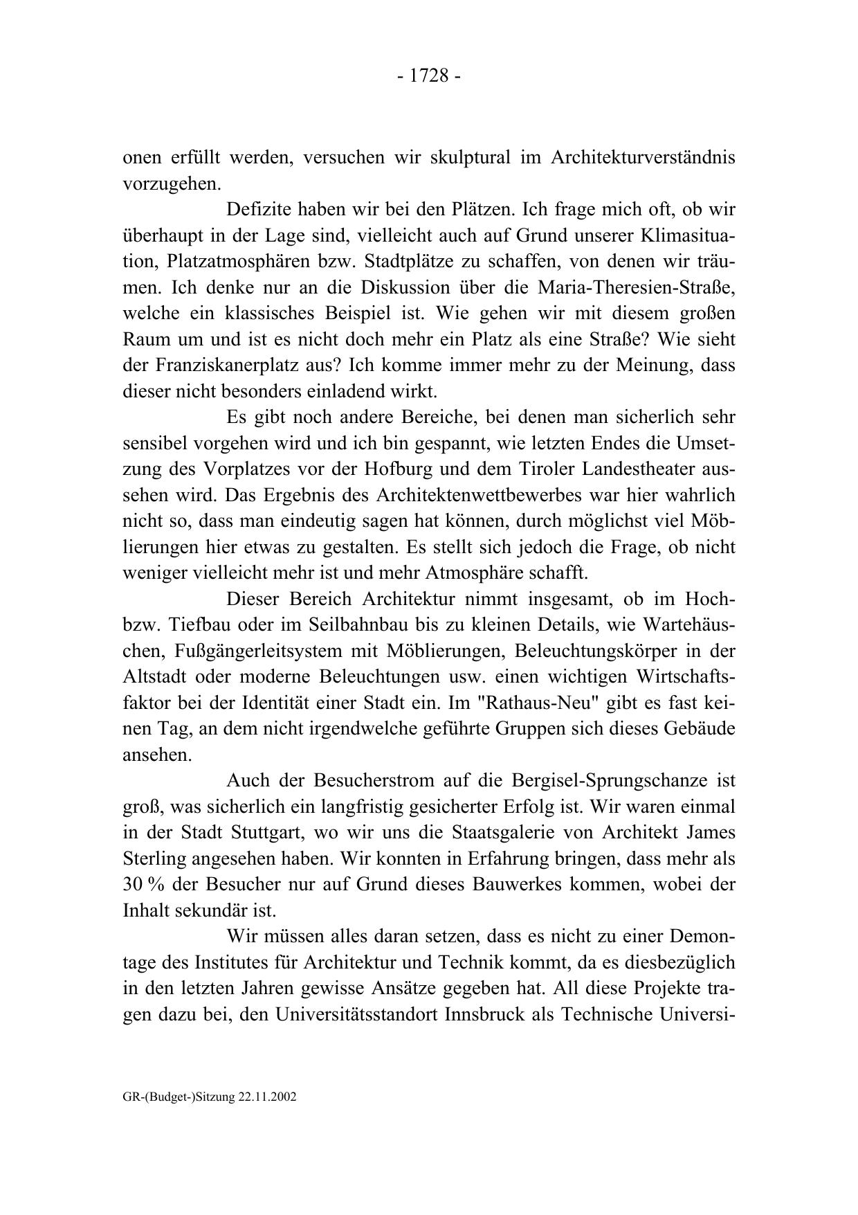 sensibel vorgehen wird und ich bin gespannt, wie letzten Endes die Umsetzung des Vorplatzes vor der Hofburg und dem Tiroler Landestheater aussehen wird. Das Ergebnis des Architektenwettbewerbes war hier wahrlich
