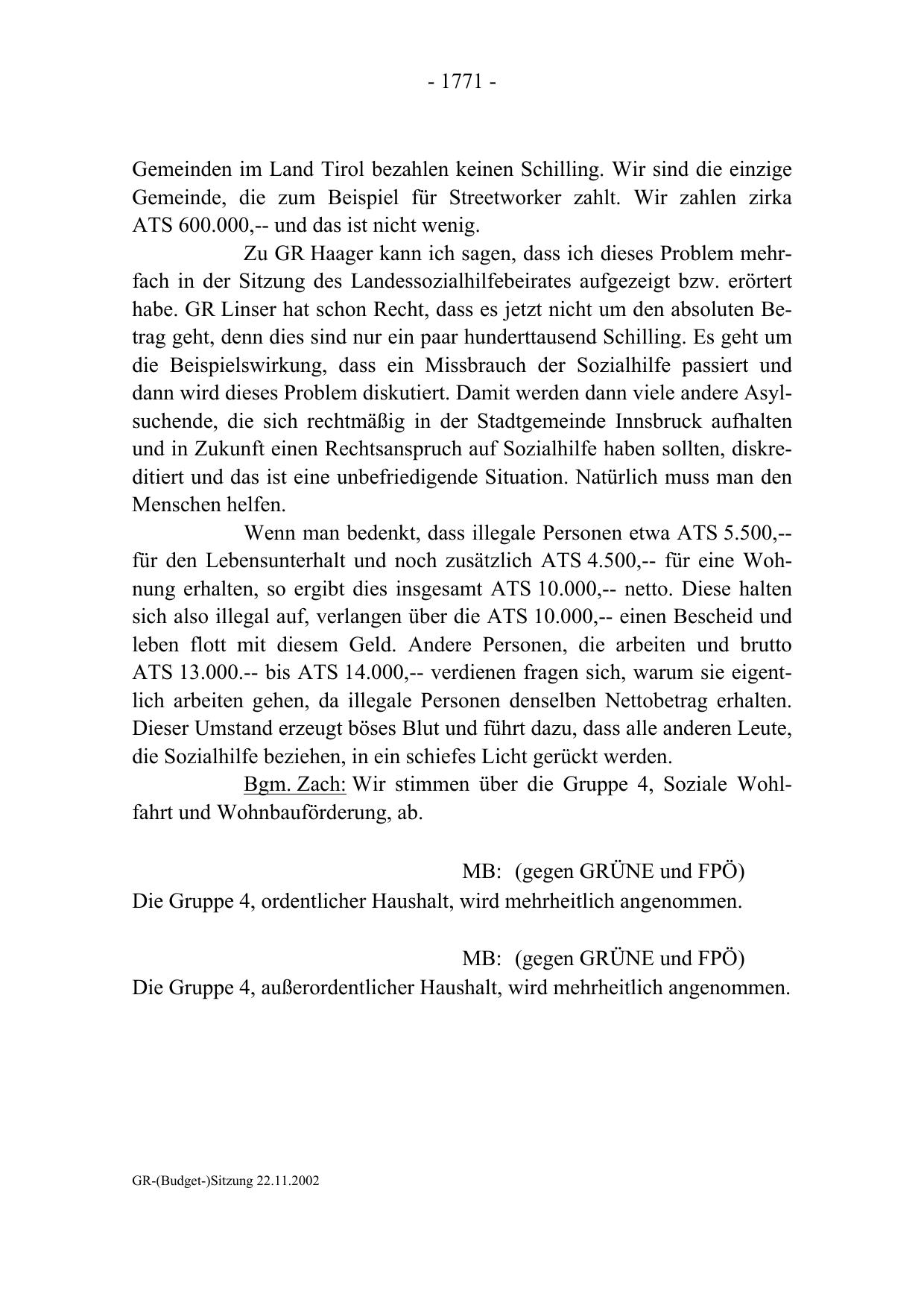 Bgm. Zach: Wir stimmen über die Gruppe 4, Soziale Wohlfahrt und Wohnbauförderung, ab.
