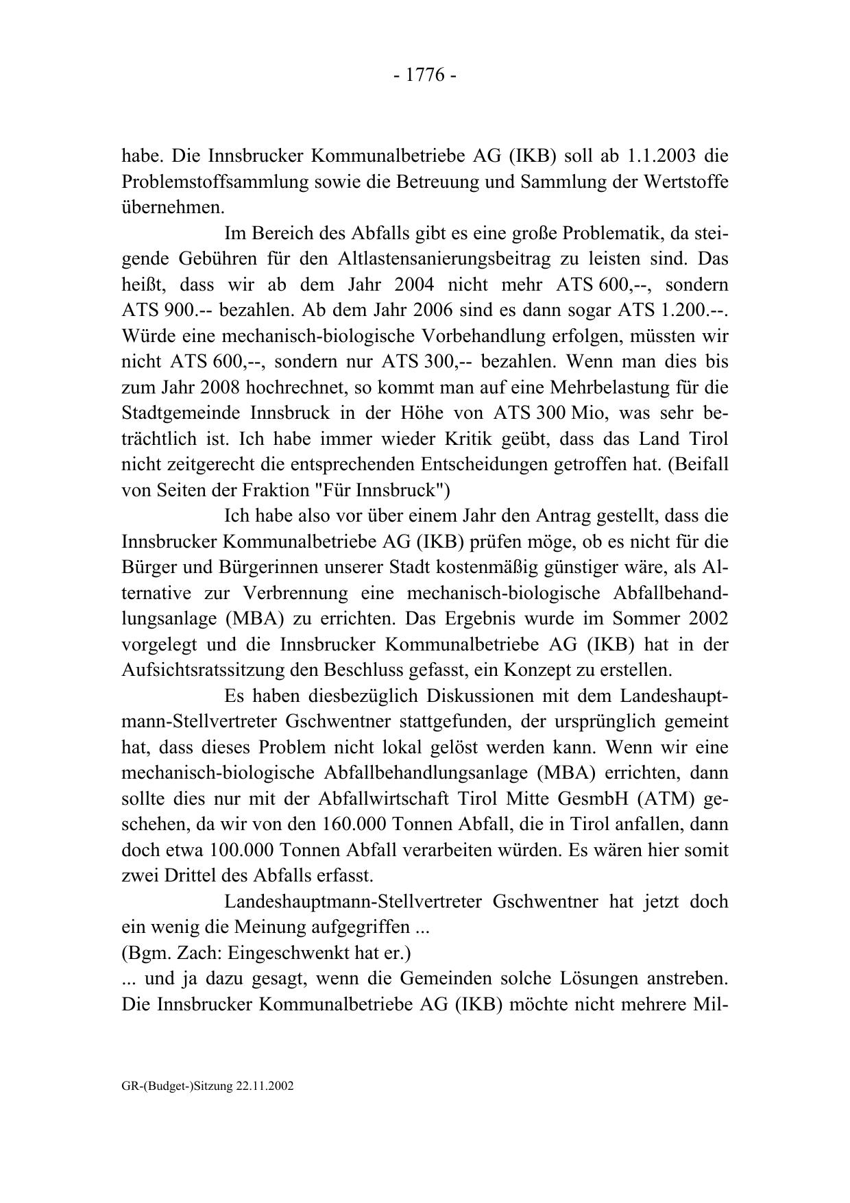 Stadtgemeinde Innsbruck in der Höhe von ATS 300 Mio, was sehr beträchtlich ist. Ich habe immer wieder Kritik geübt, dass das Land Tirol