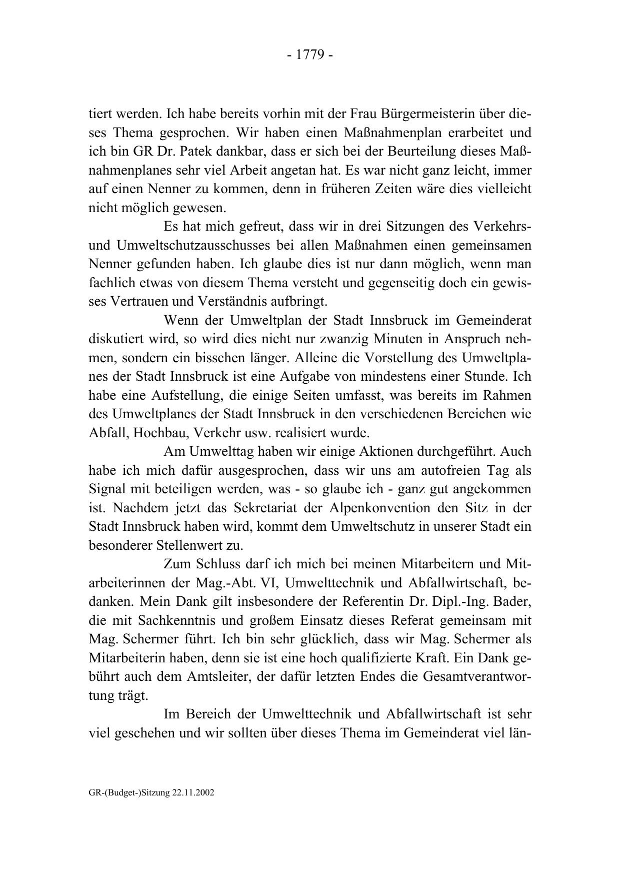 diskutiert wird, so wird dies nicht nur zwanzig Minuten in Anspruch nehmen, sondern ein bisschen länger. Alleine die Vorstellung des Umweltplanes der Stadt Innsbruck ist eine Aufgabe von mindestens einer Stunde. Ich