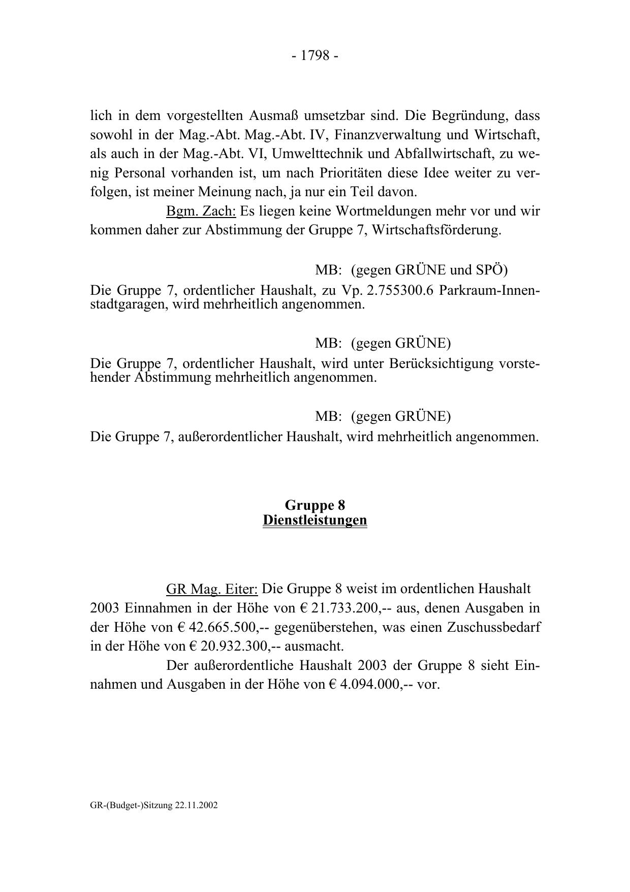 Der außerordentliche Haushalt 2003 der Gruppe 8 sieht Einnahmen und Ausgaben in der Höhe von € 4.094.000,-- vor.