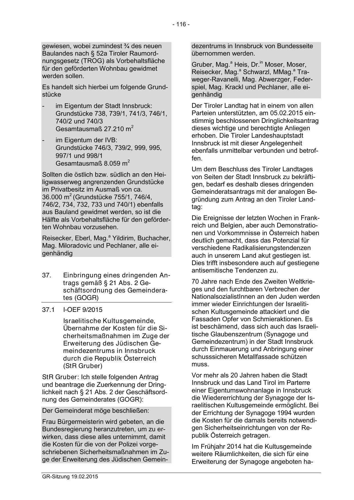 von Seiten der Stadt Innsbruck zu bekräftigen, bedarf es deshalb dieses dringenden