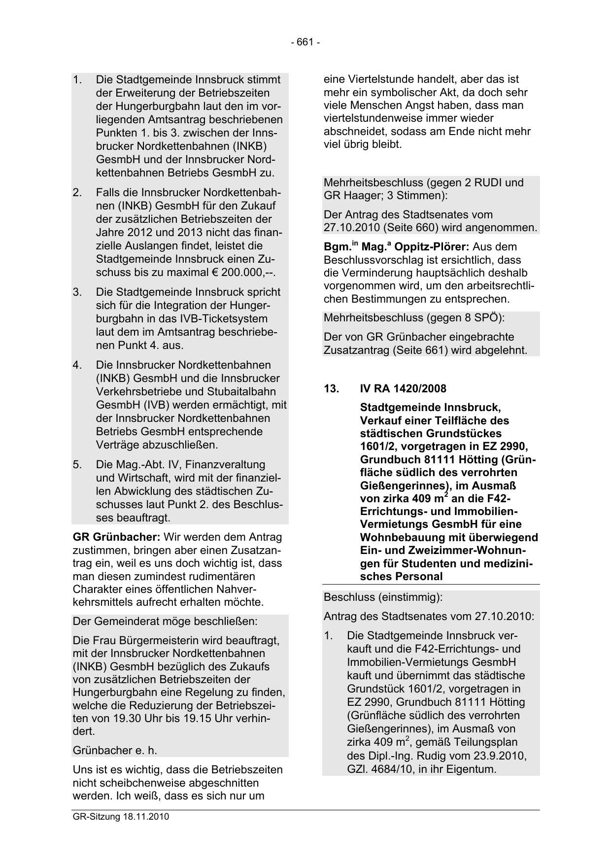 der Hungerburgbahn laut den im vorliegenden Amtsantrag beschriebenen