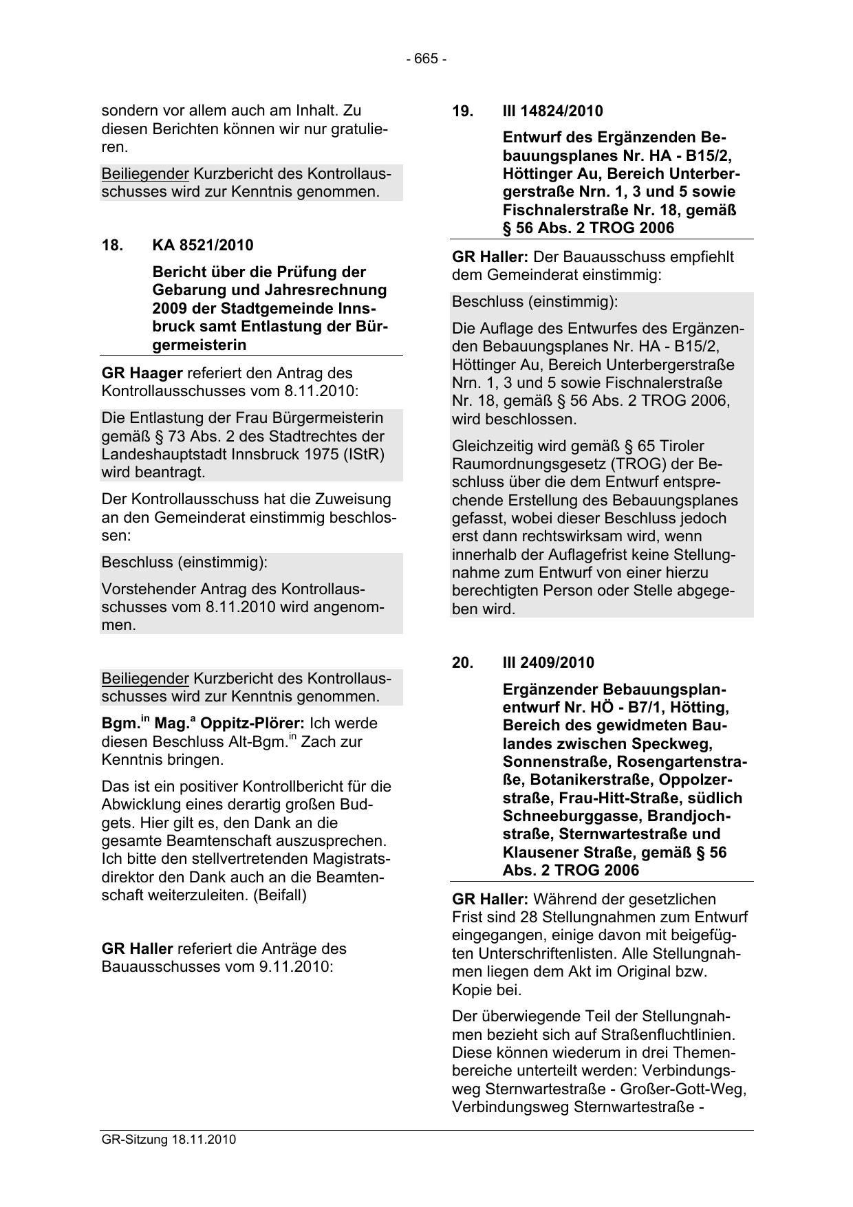 2009 der Stadtgemeinde Innsbruck samt Entlastung der Bürgermeisterin
