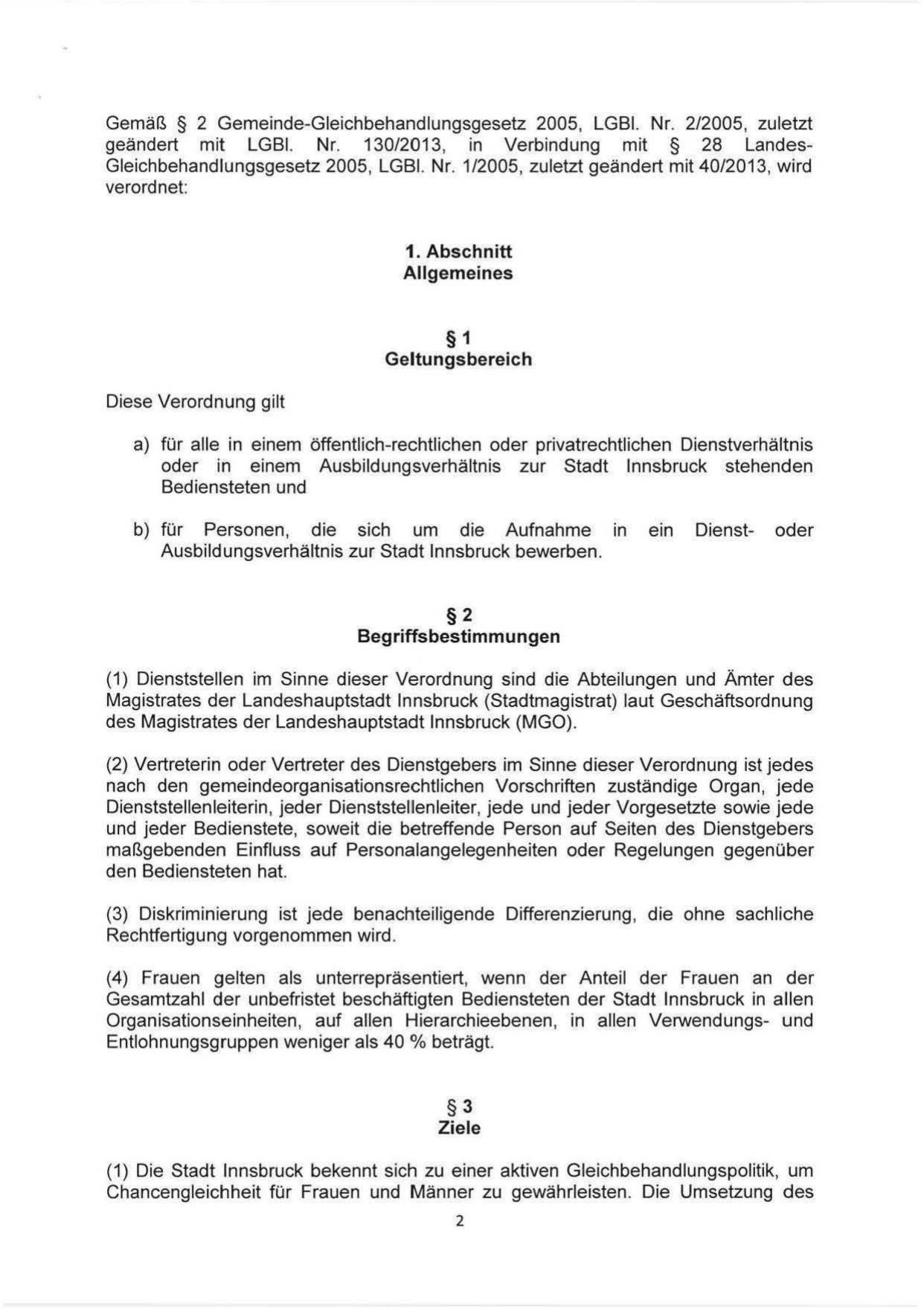 (1) Die Stadt Innsbruck bekennt sich zu einer aktiven Gleichbehandlungspolitik, um
