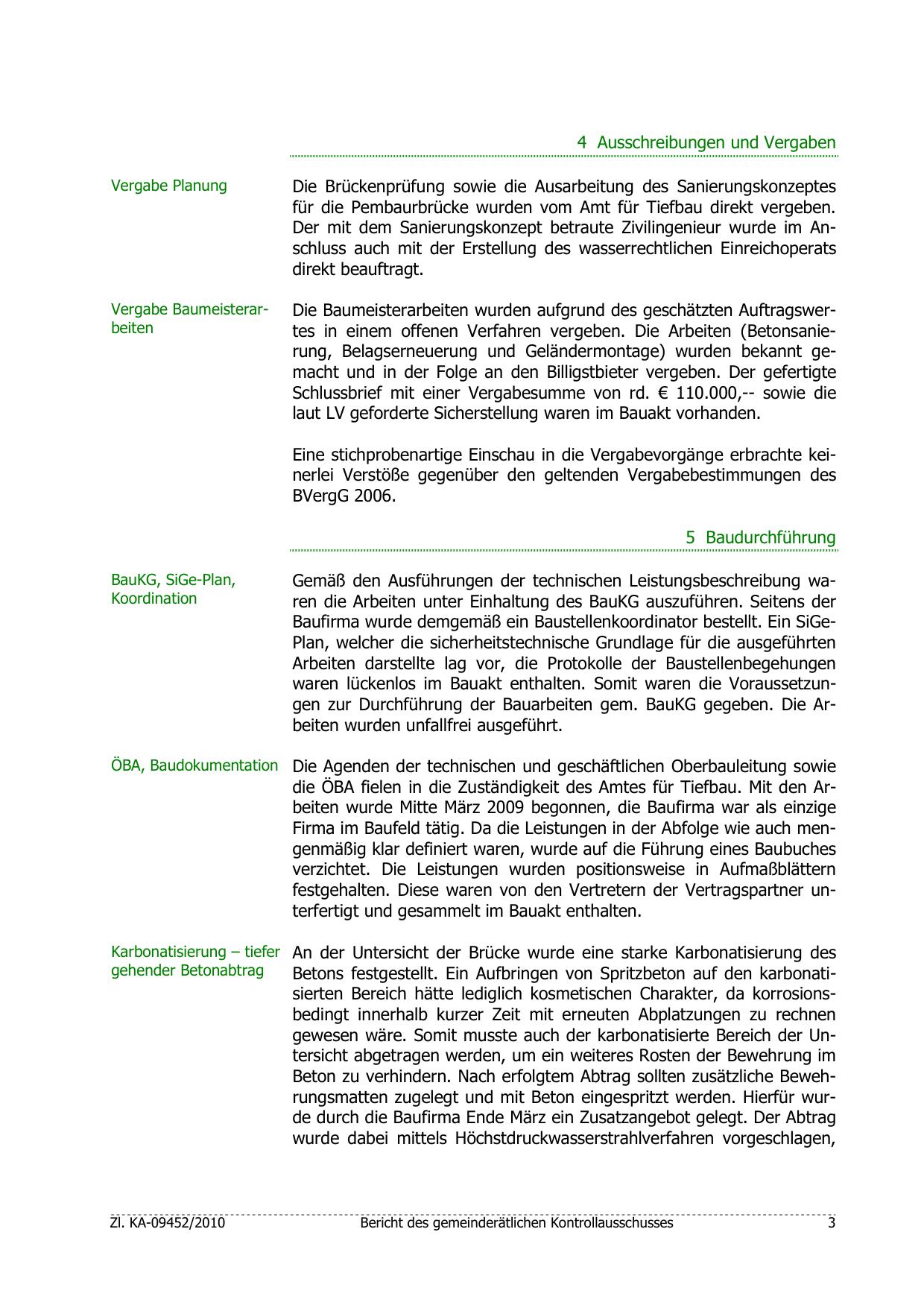 Die Baumeisterarbeiten wurden aufgrund des geschätzten Auftragswertes in einem offenen Verfahren vergeben. Die Arbeiten (Betonsanierung, Belagserneuerung und Geländermontage) wurden bekannt gemacht und in der Folge an den Billigstbieter vergeben. Der gefertigte