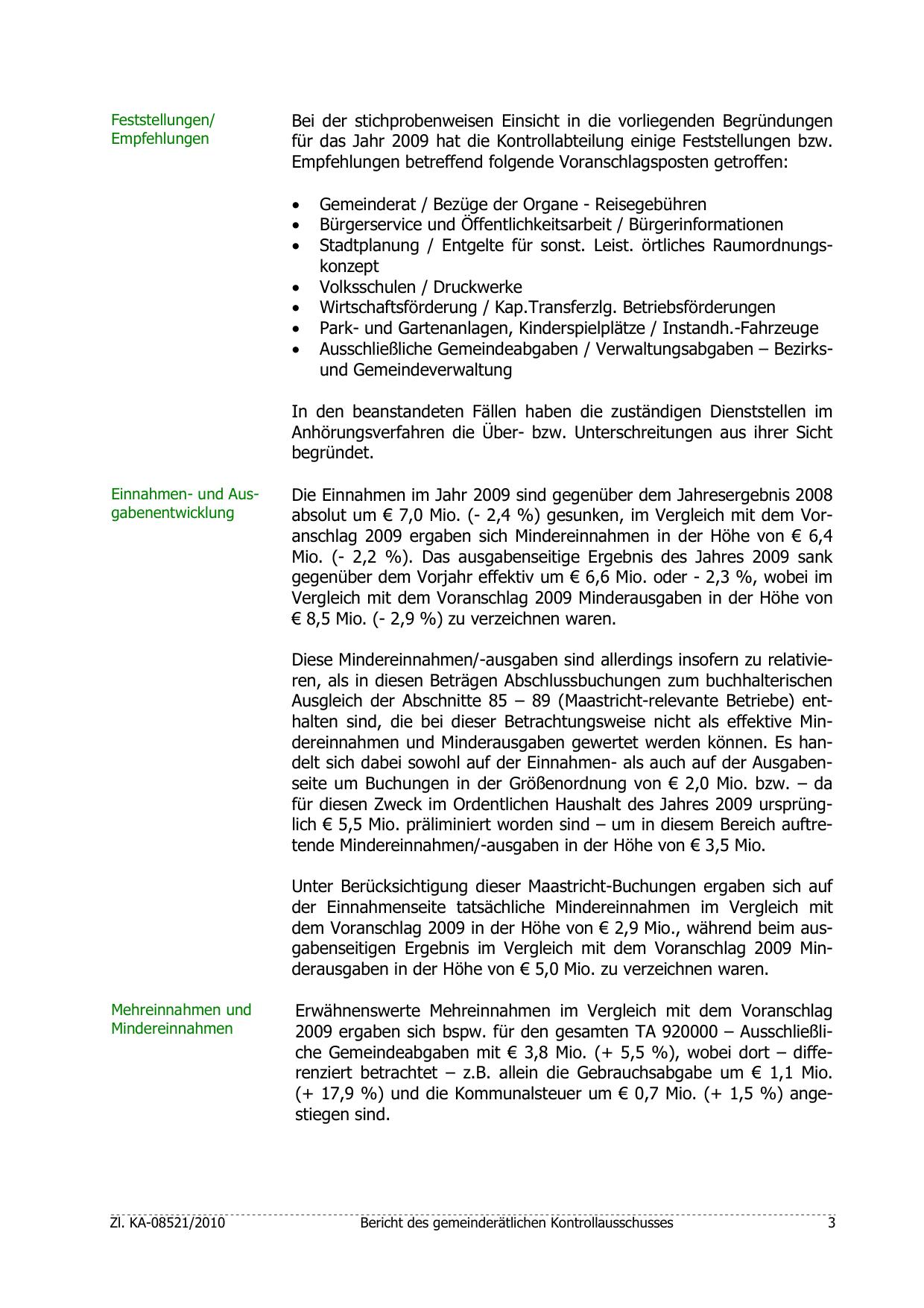 absolut um € 7,0 Mio. (- 2,4 %) gesunken, im Vergleich mit dem Voranschlag 2009 ergaben sich Mindereinnahmen in der Höhe von € 6,4