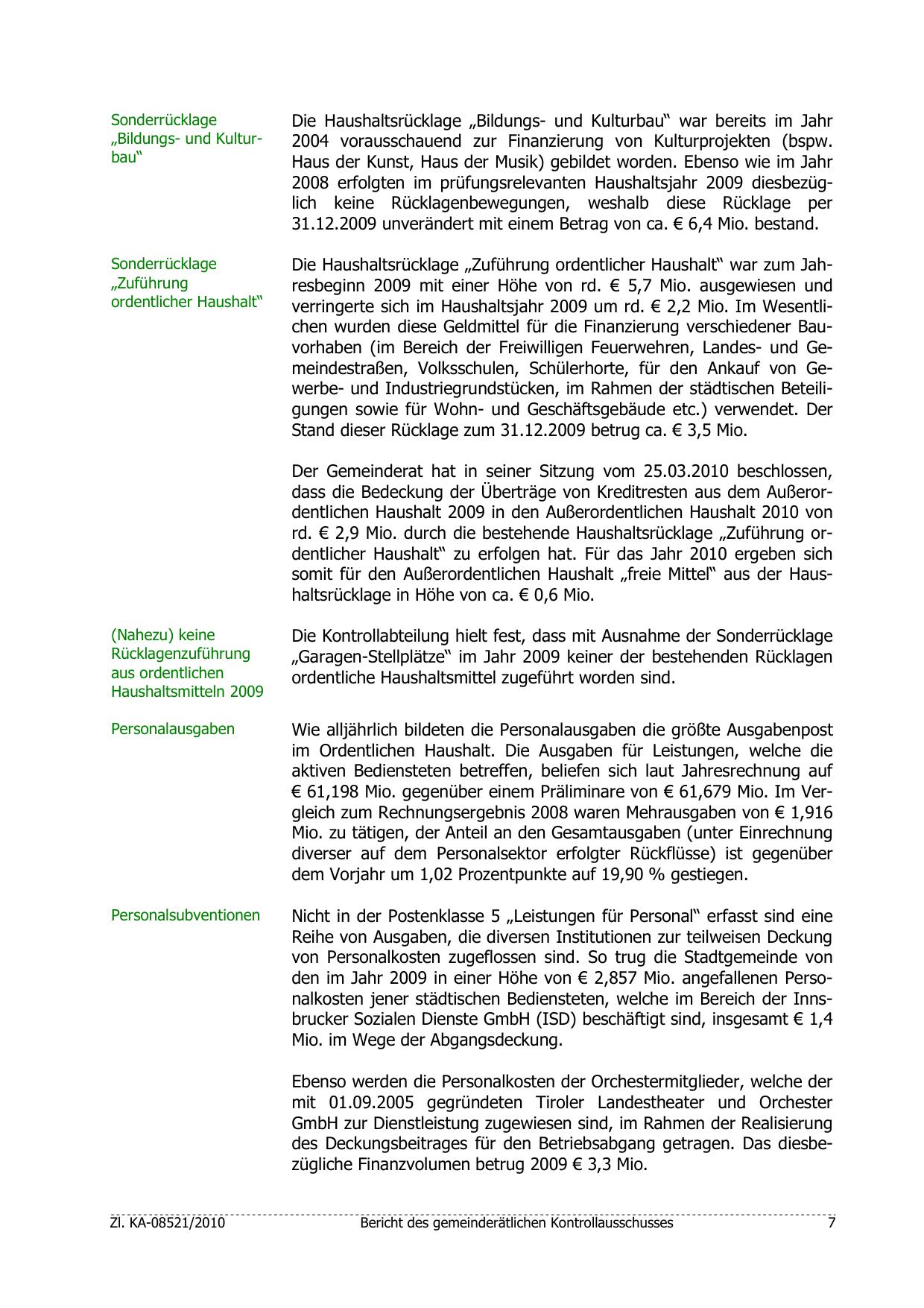 rd. € 2,9 Mio. durch die bestehende Haushaltsrücklage „Zuführung ordentlicher Haushalt“ zu erfolgen hat. Für das Jahr 2010 ergeben sich