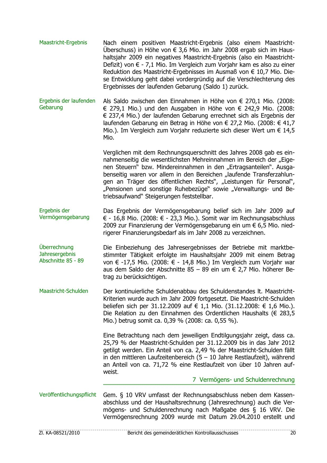 Nach einem positiven Maastricht-Ergebnis (also einem MaastrichtÜberschuss) in Höhe von € 3,6 Mio. im Jahr 2008 ergab sich im Haushaltsjahr 2009 ein negatives Maastricht-Ergebnis (also ein MaastrichtDefizit) von € - 7,1 Mio. Im Vergleich zum Vorjahr kam es also zu einer