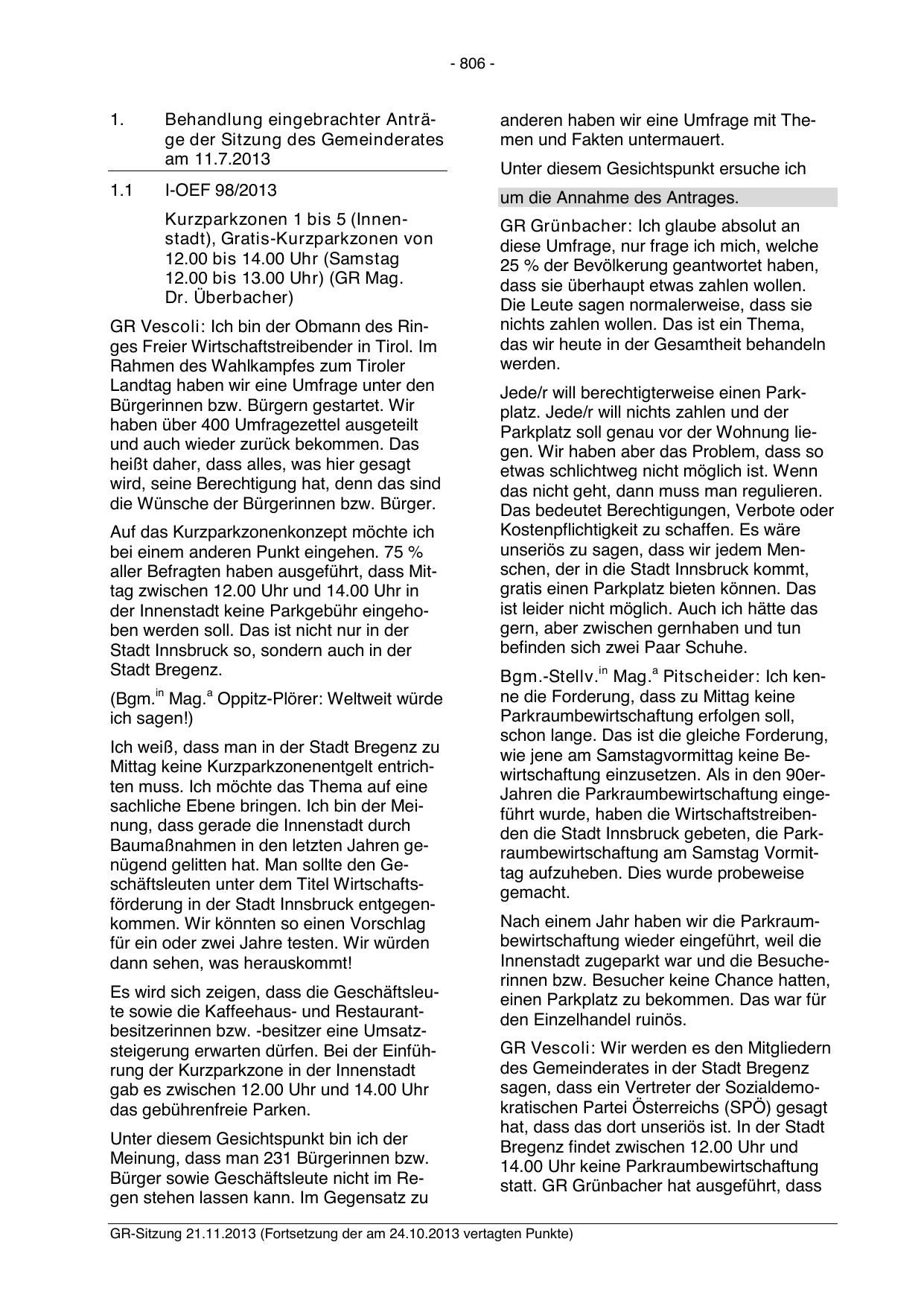 wie jene am Samstagvormittag keine Bewirtschaftung einzusetzen. Als in den 90erJahren die Parkraumbewirtschaftung eingeführt wurde, haben die Wirtschaftstreibenden die Stadt Innsbruck gebeten, die Parkraumbewirtschaftung am Samstag Vormittag aufzuheben. Dies wurde probeweise