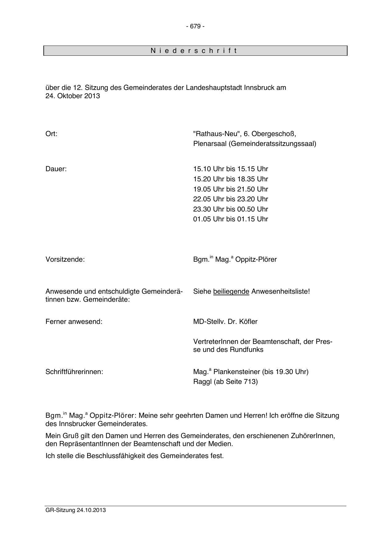 Bgm.in Mag.a Oppitz-Plörer: Meine sehr geehrten Damen und Herren! Ich eröffne die Sitzung