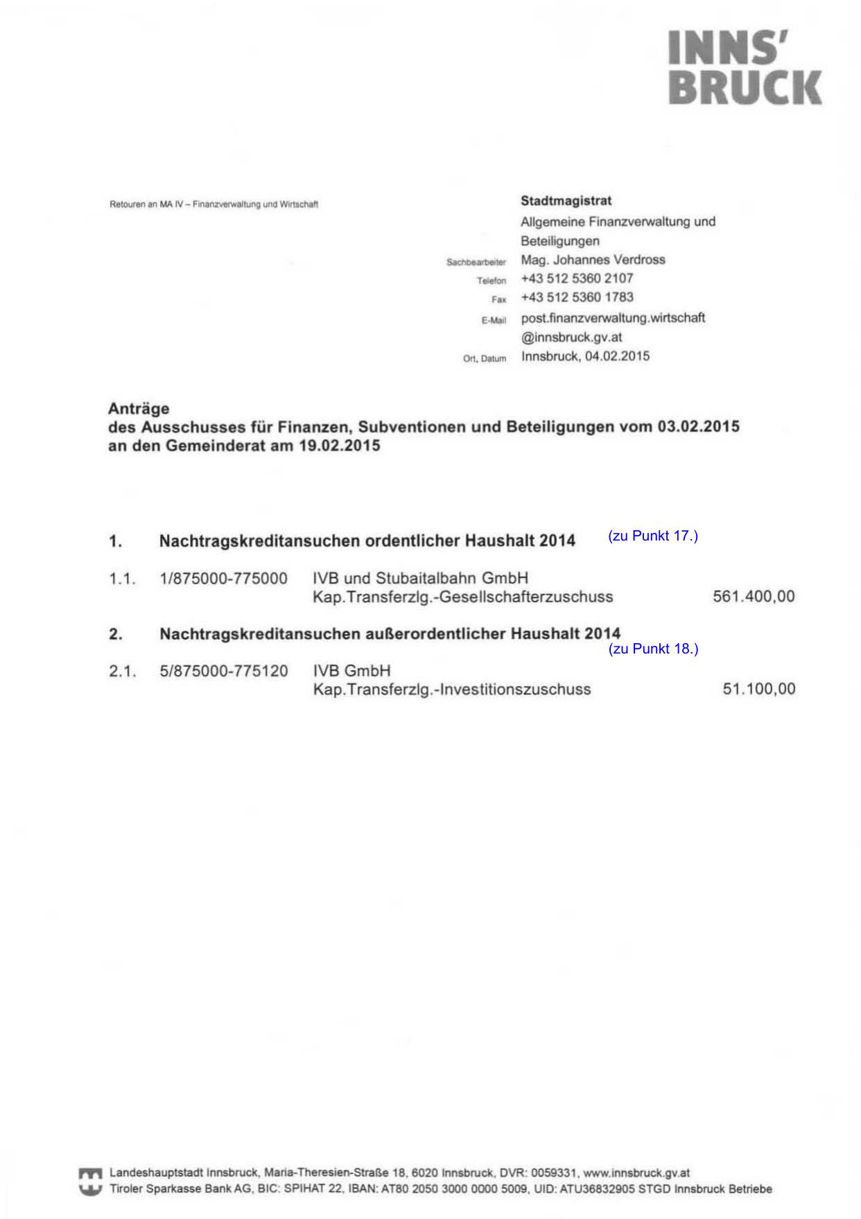 Nachtragskreditansuchen außerordentlicher Haushalt 2014
