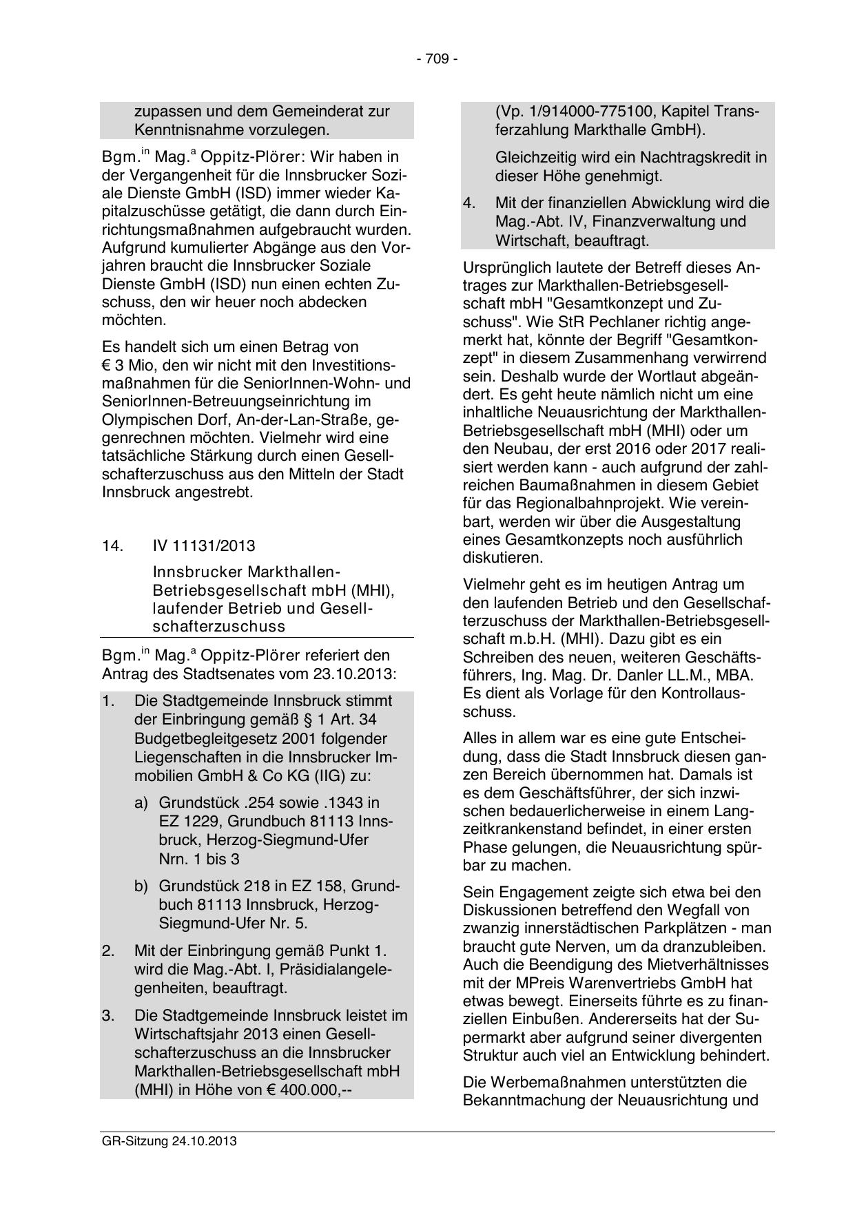Ursprünglich lautete der Betreff dieses Antrages zur Markthallen-Betriebsgesellschaft mbH "Gesamtkonzept und Zuschuss". Wie StR Pechlaner richtig angemerkt hat, könnte der Begriff "Gesamtkonzept" in diesem Zusammenhang verwirrend