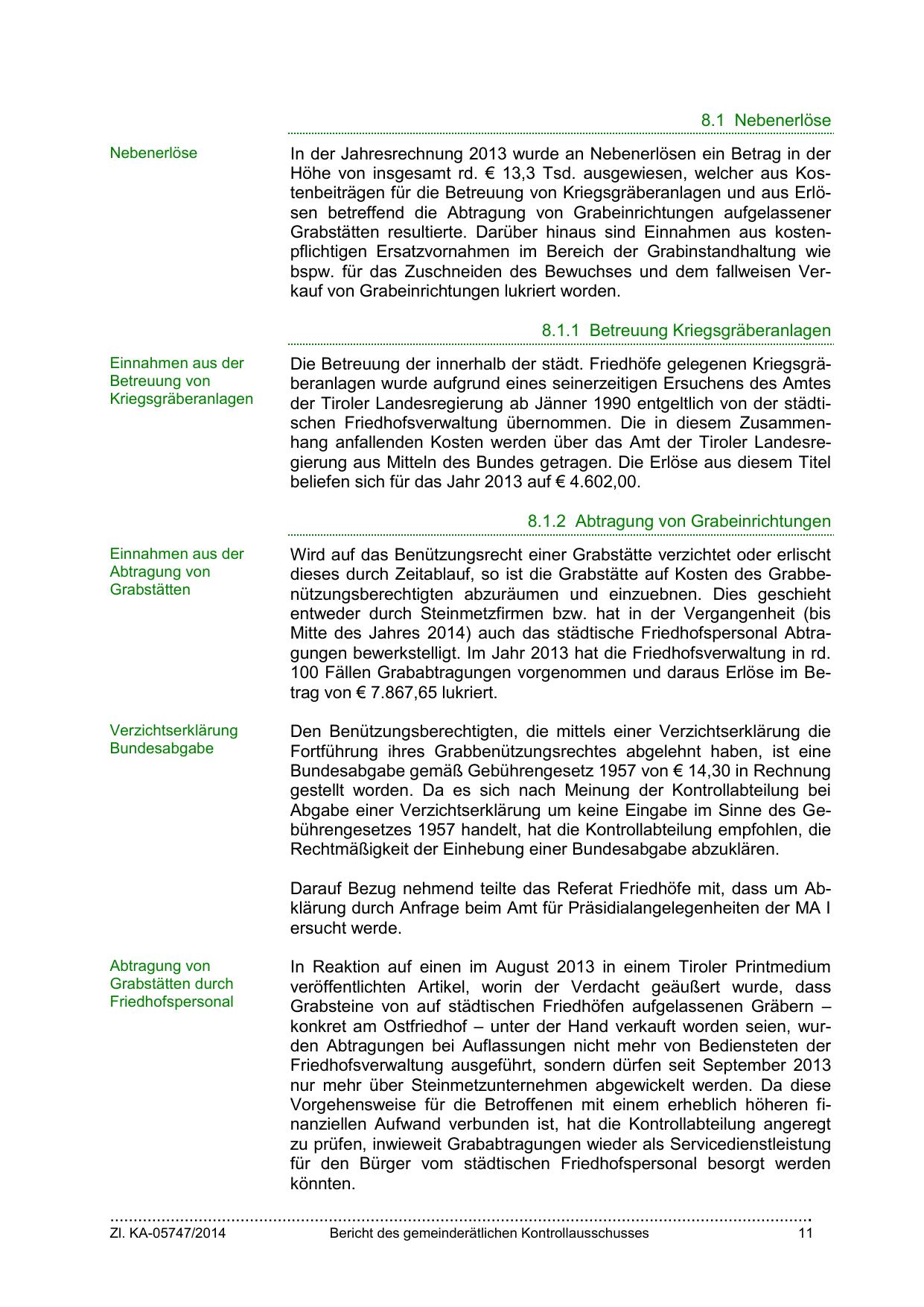 Höhe von insgesamt rd. € 13,3 Tsd. ausgewiesen, welcher aus Kostenbeiträgen für die Betreuung von Kriegsgräberanlagen und aus Erlösen betreffend die Abtragung von Grabeinrichtungen aufgelassener
