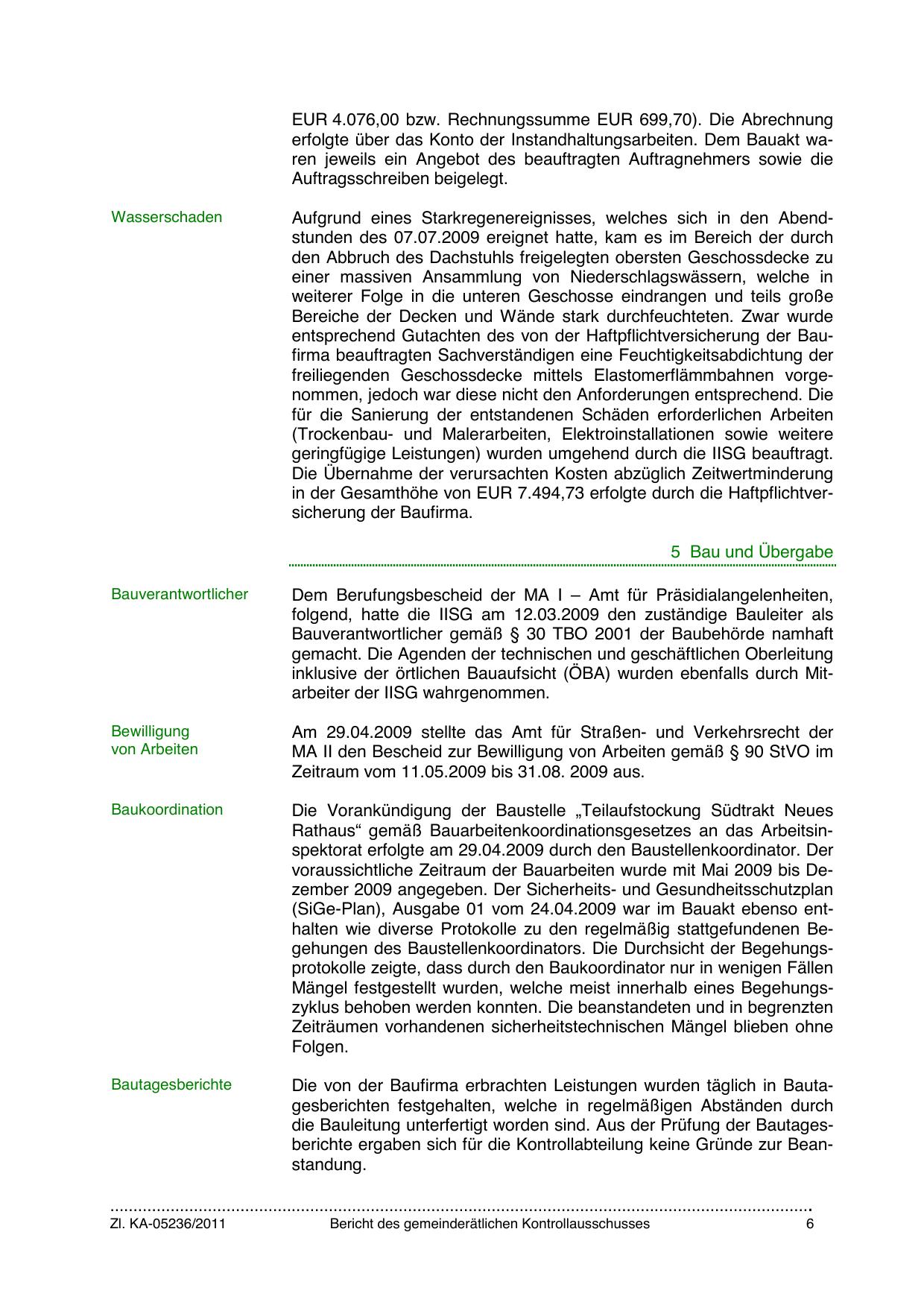 die Bauleitung unterfertigt worden sind. Aus der Prüfung der Bautagesberichte ergaben sich für die Kontrollabteilung keine Gründe zur Beanstandung.