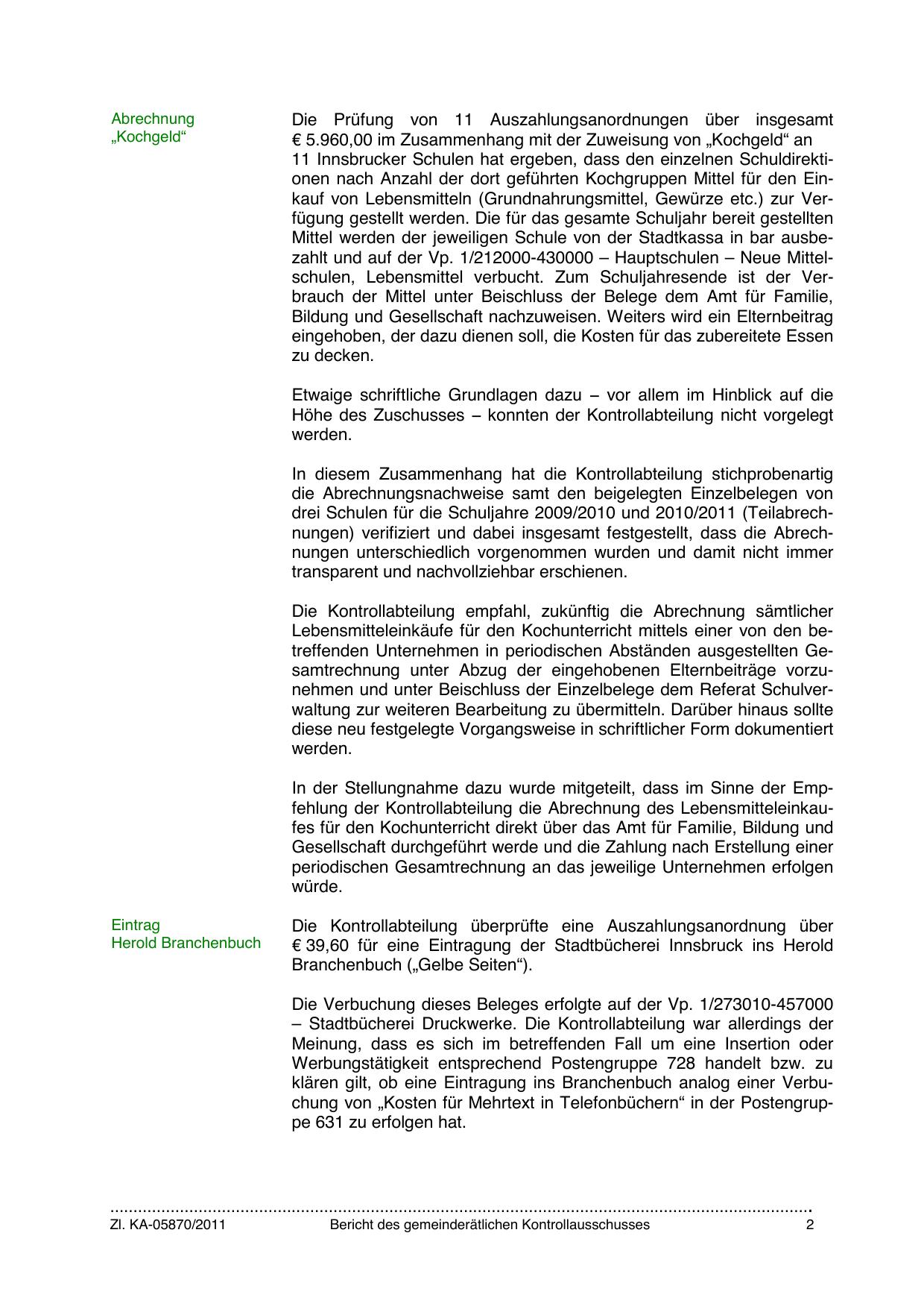 In der Stellungnahme dazu wurde mitgeteilt, dass im Sinne der Empfehlung der Kontrollabteilung die Abrechnung des Lebensmitteleinkaufes für den Kochunterricht direkt über das Amt für Familie, Bildung und