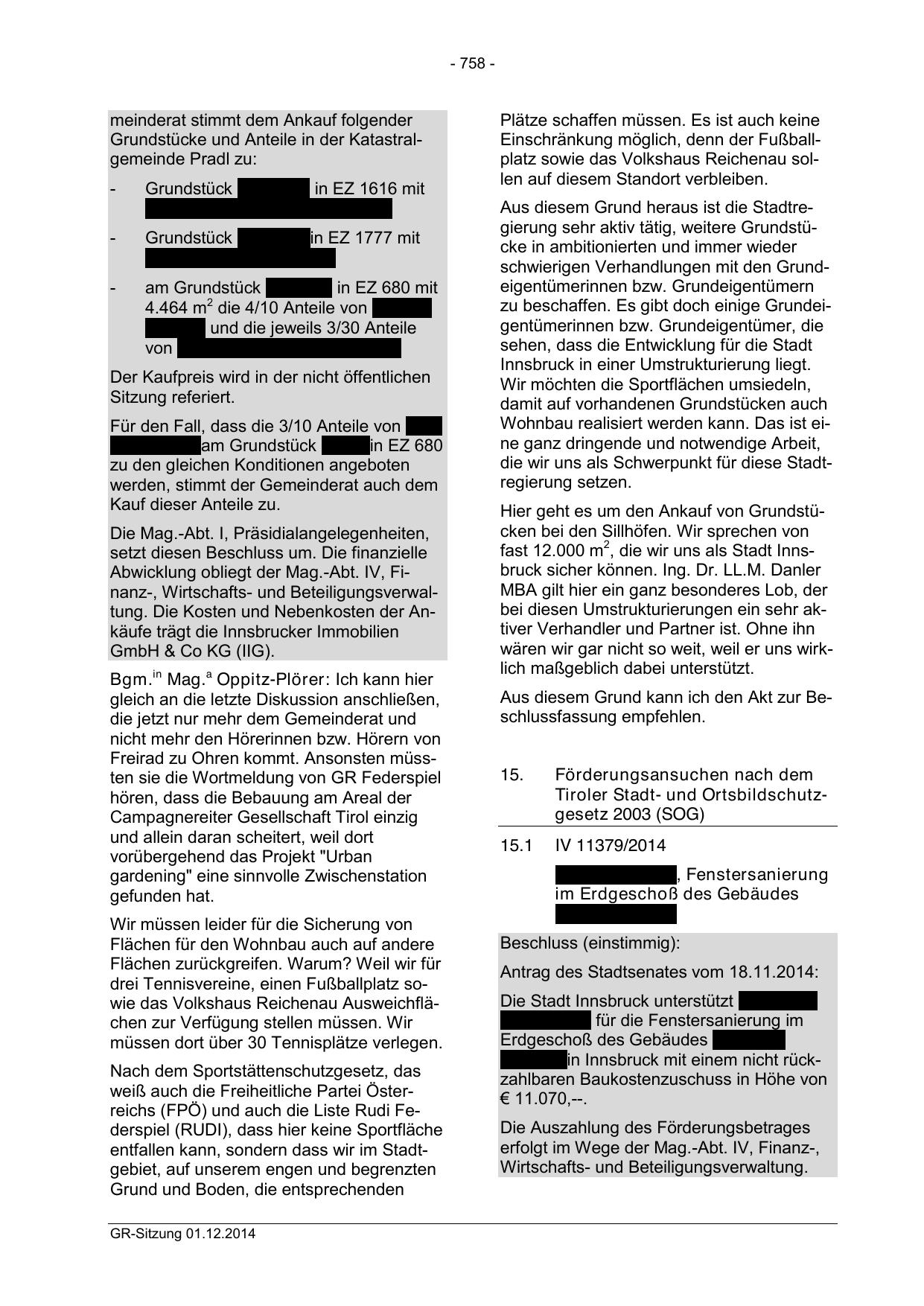 Abwicklung obliegt der Mag.-Abt. IV, Finanz-, Wirtschafts- und Beteiligungsverwaltung. Die Kosten und Nebenkosten der Ankäufe trägt die Innsbrucker Immobilien