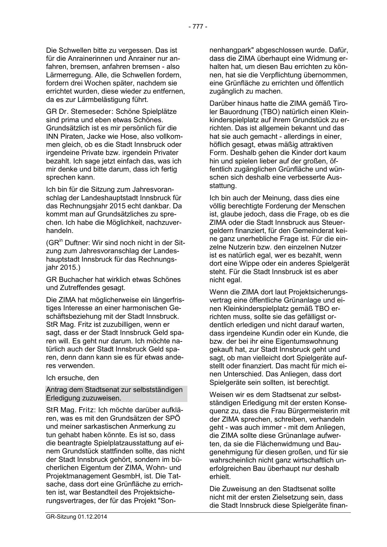 (GRin Duftner: Wir sind noch nicht in der Sitzung zum Jahresvoranschlag der Landeshauptstadt Innsbruck für das Rechnungsjahr 2015.)