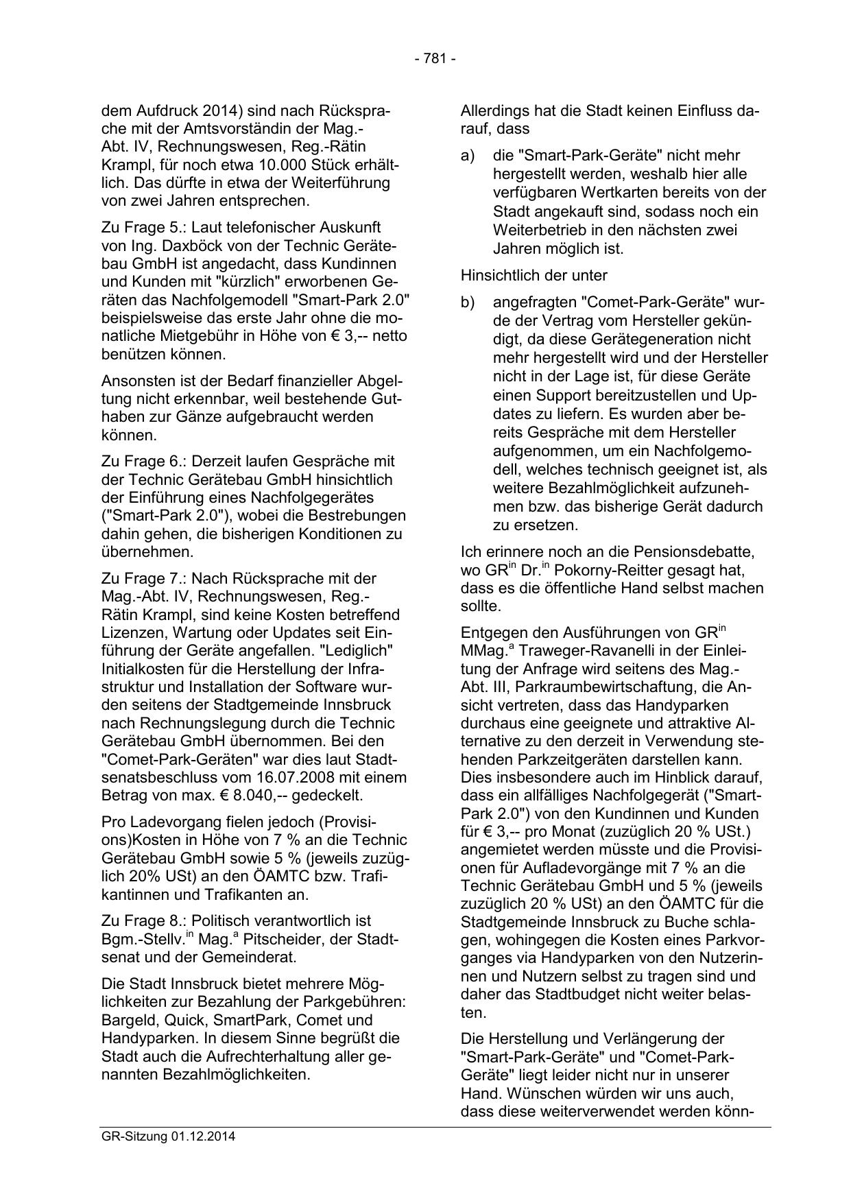 Stadtgemeinde Innsbruck zu Buche schlagen, wohingegen die Kosten eines Parkvorganges via Handyparken von den Nutzerinnen und Nutzern selbst zu tragen sind und
