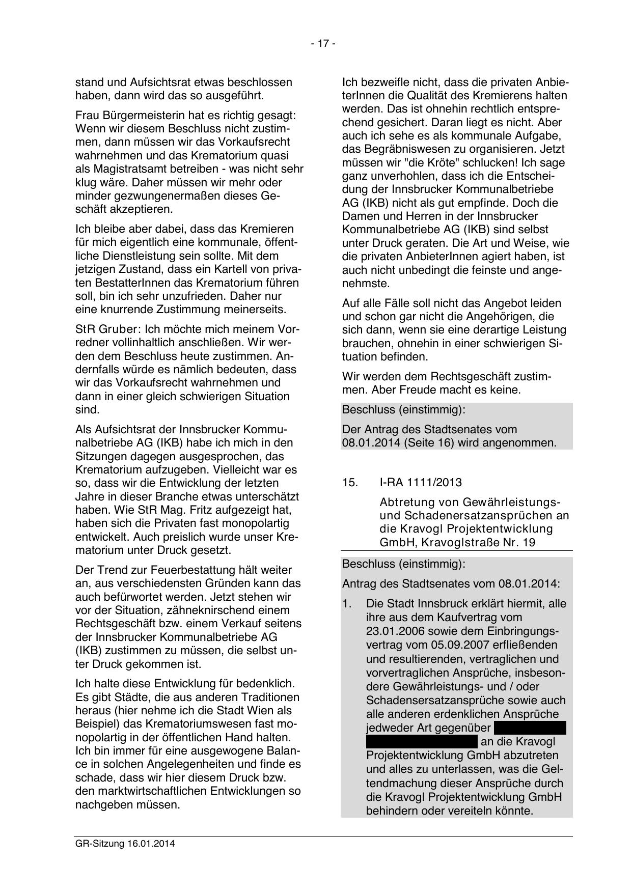 StR Gruber: Ich möchte mich meinem Vorredner vollinhaltlich anschließen. Wir werden dem Beschluss heute zustimmen. Andernfalls würde es nämlich bedeuten, dass