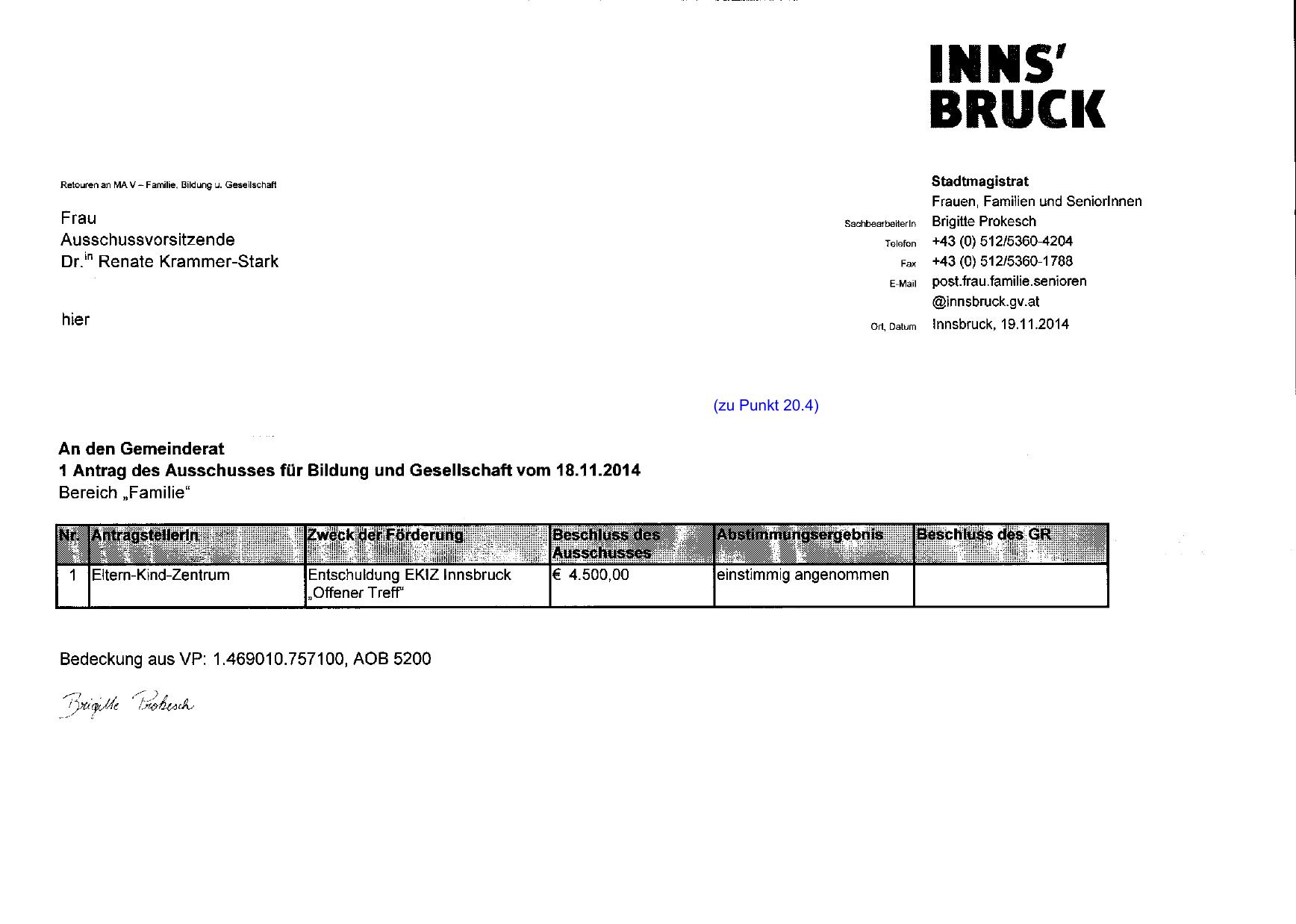 1 Antrag des Ausschusses für Bildung und Gesellschaft vom 18.11.2014