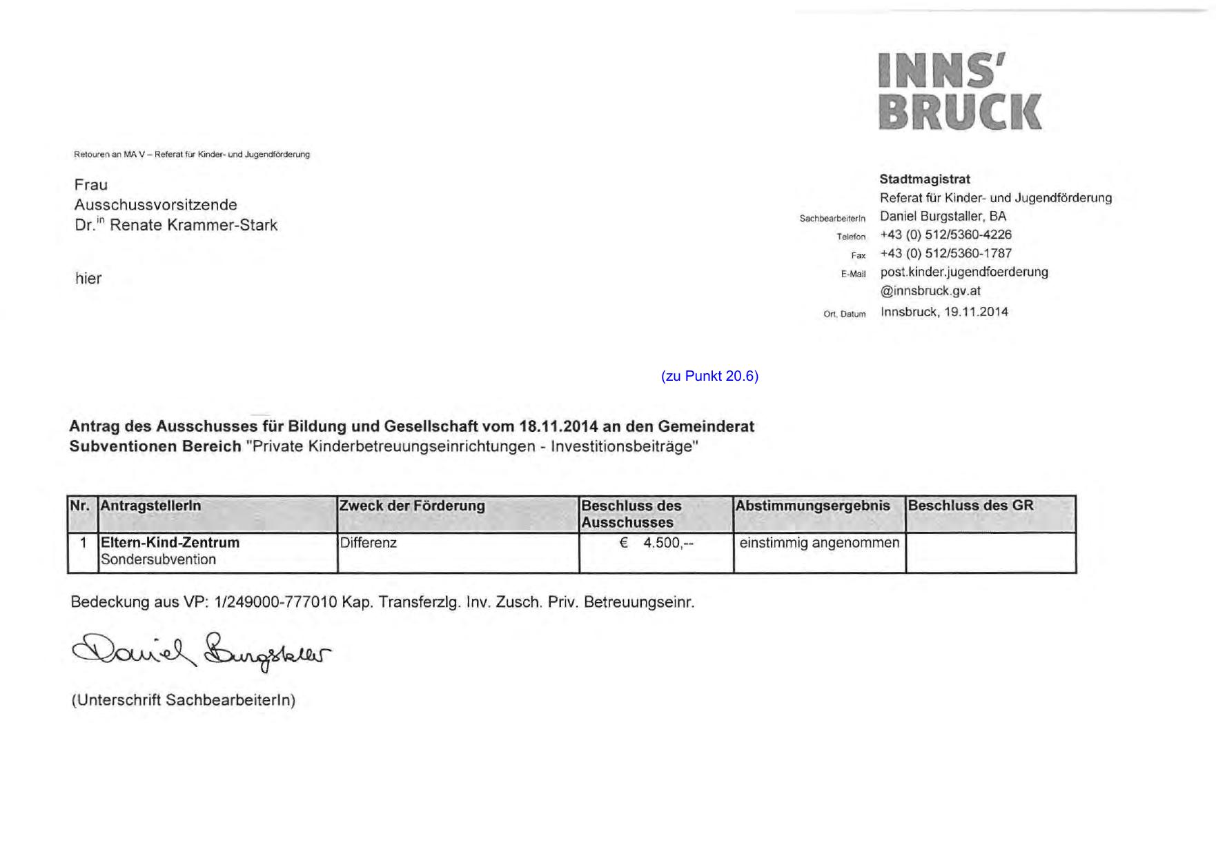 Bedeckung aus VP: 1/249000-777010 Kap. Transferzlg. Inv. Zusch. Priv. Betreuungseinr.